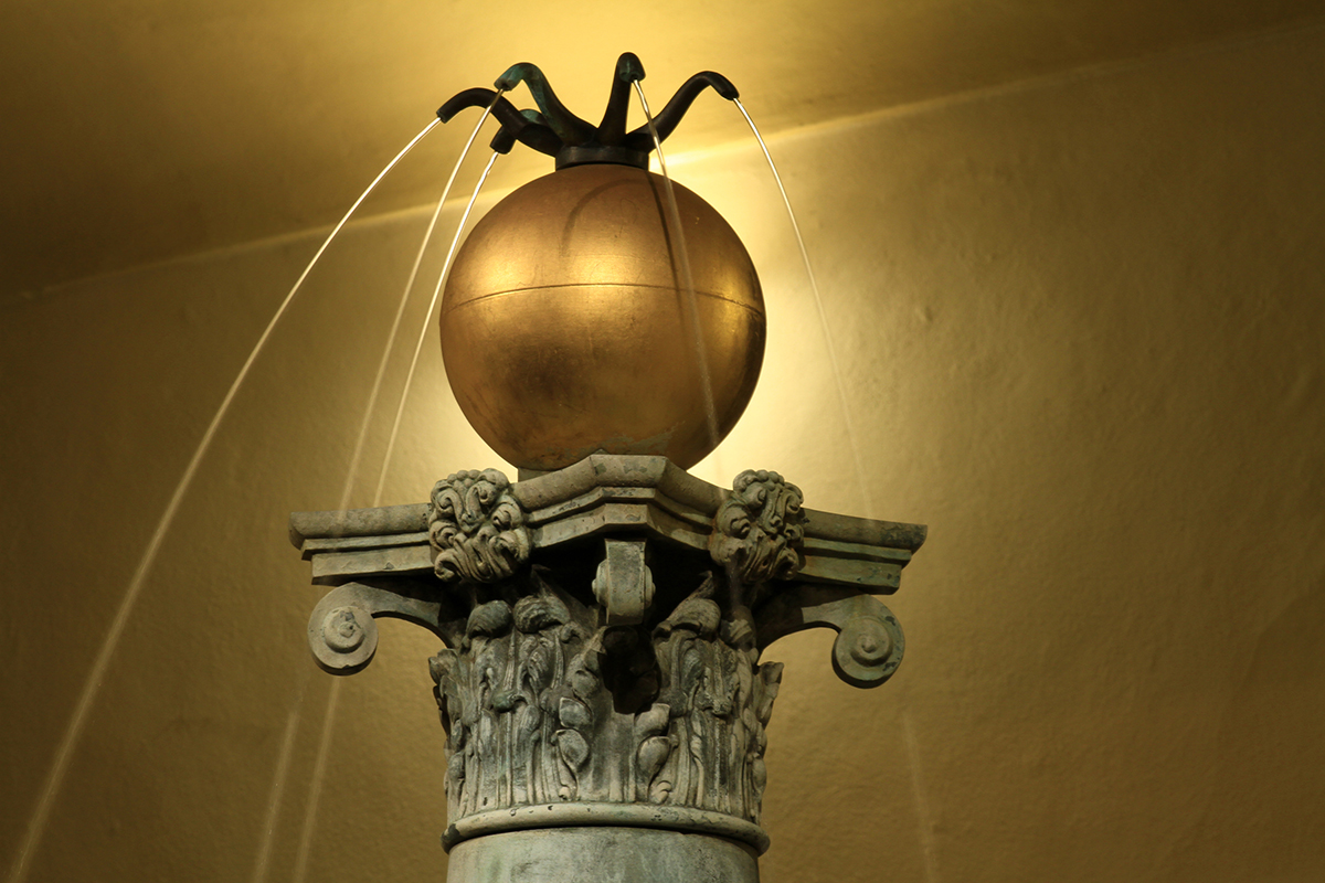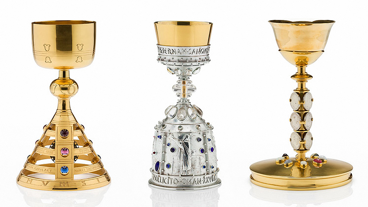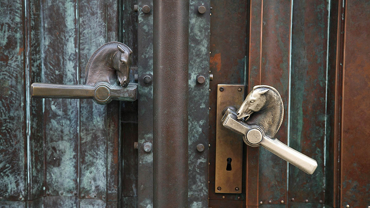 Kairėje: liturginių indų serija, XX a. 4 deš. Dešinėje: durų rankenos bibliotekos pastate vaizduoja Pegaso žirgą.
