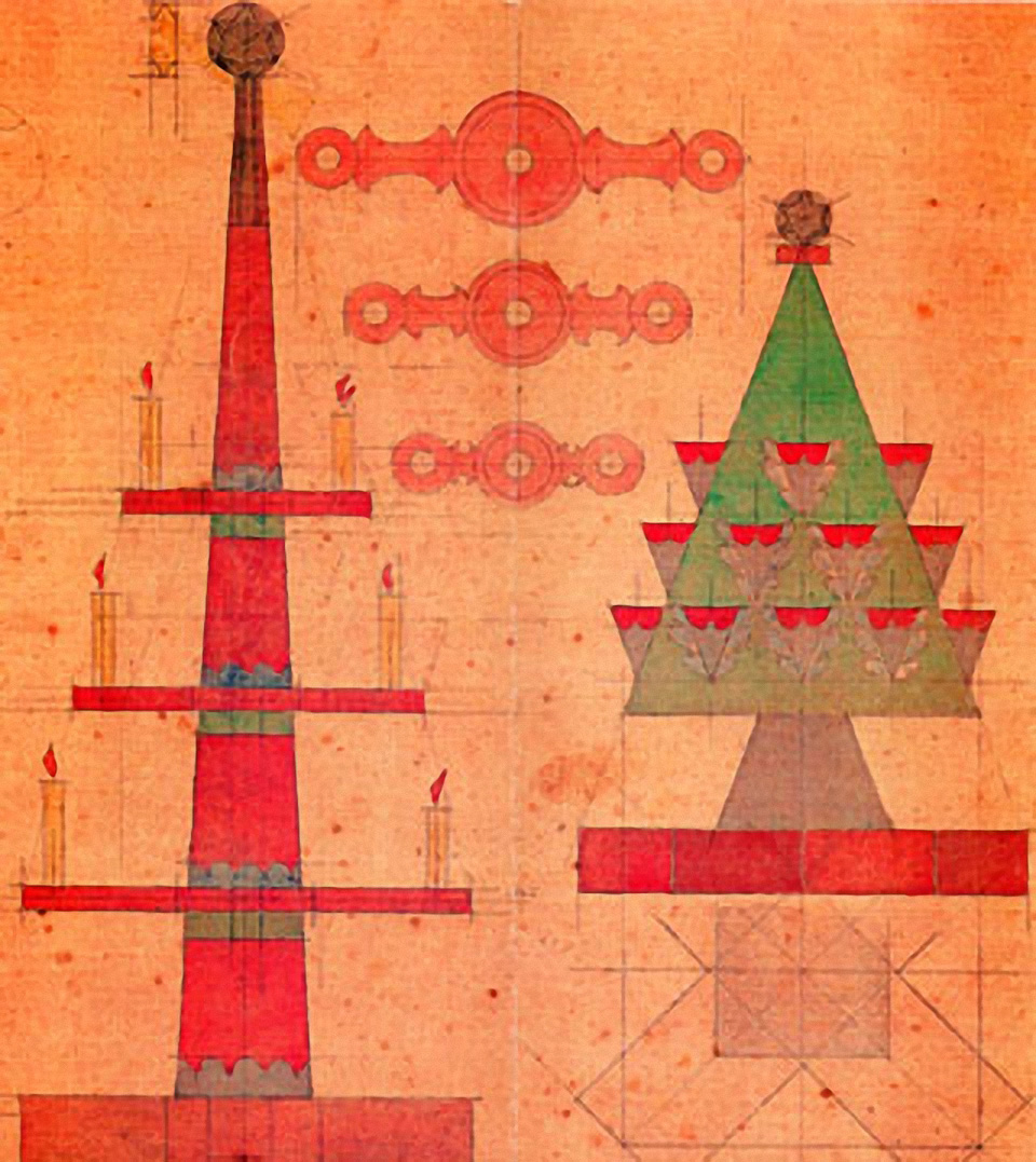 Kairėje: suvenyrinių medinių eglučių projektas ir modeliai, 1942 m. Dešinėje: trigubas tiltas per Liublianos upę (vaizdas iš oro). Liubliana, 1931-1932 m.