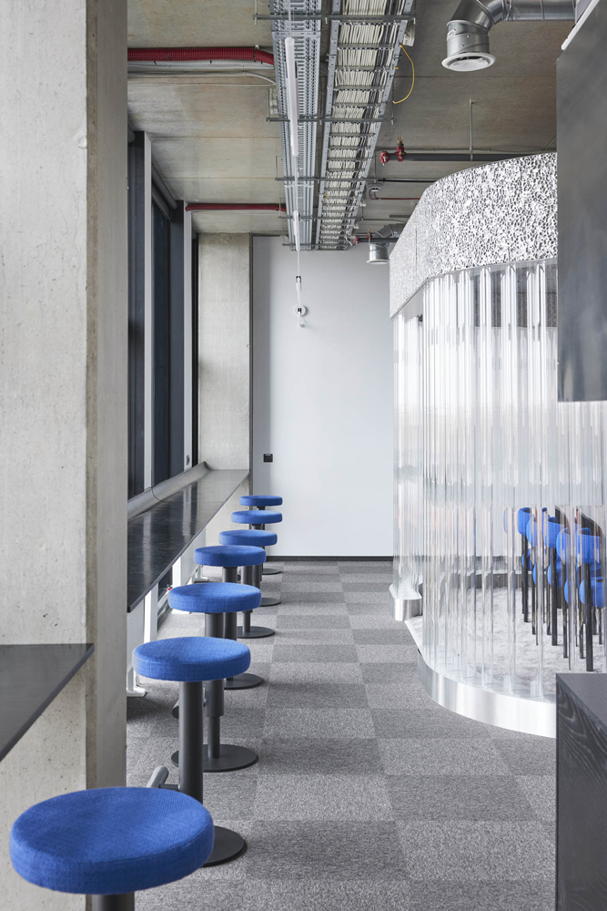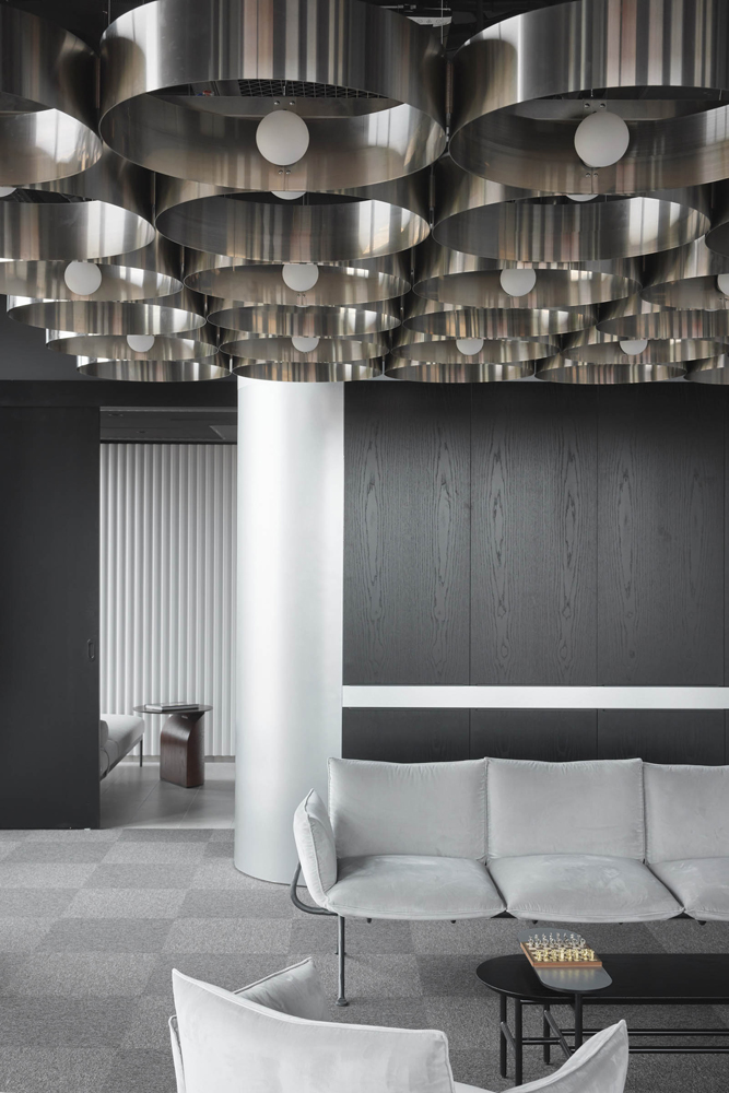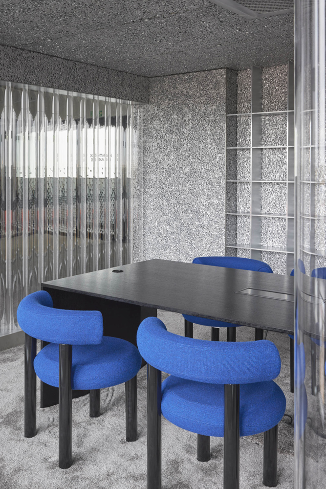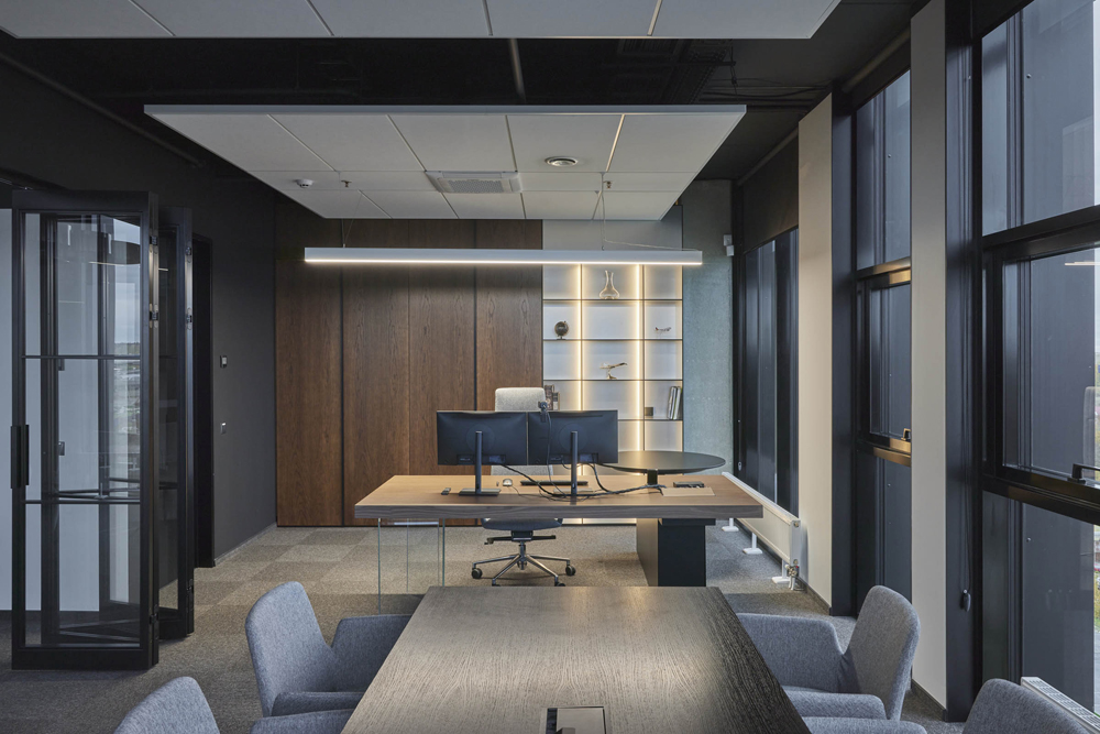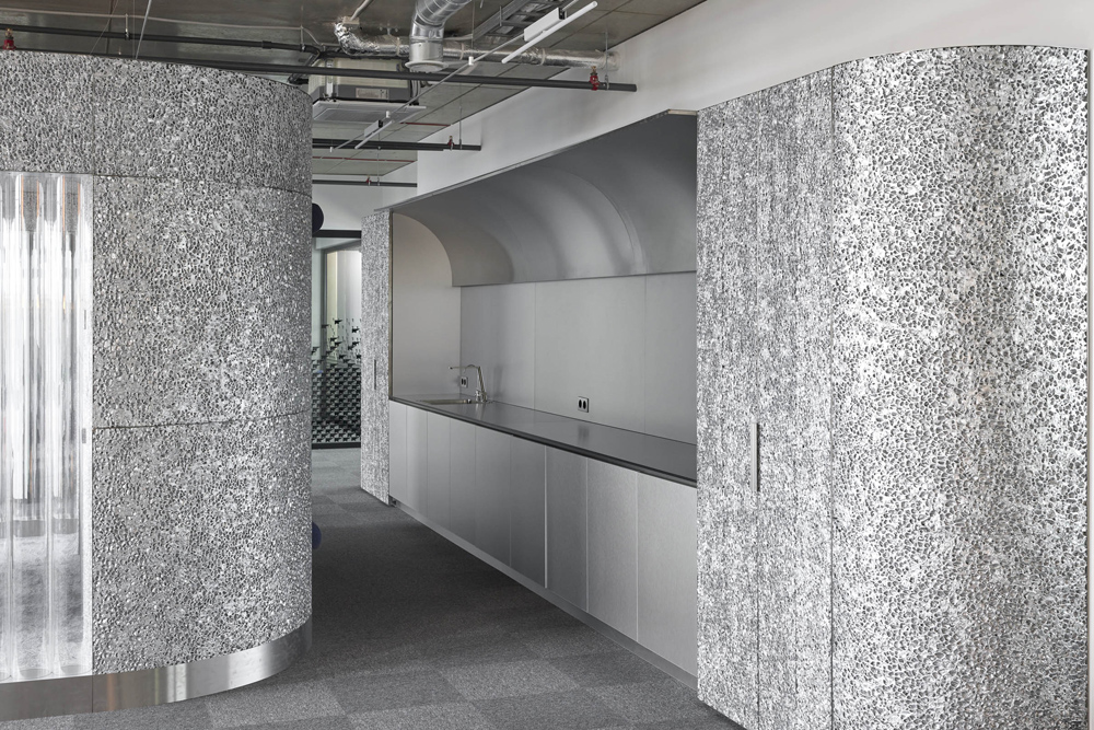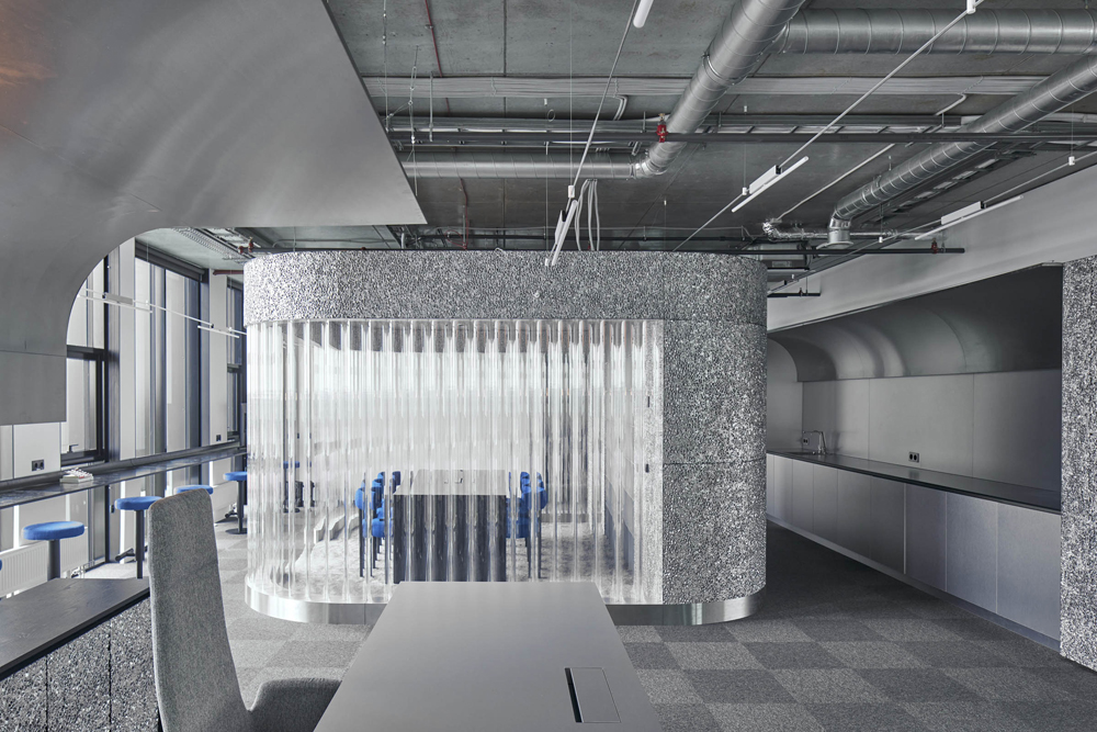 Biuro interjerui ir baldiniams sprendimams pasirinktos taipogi nuo aviacijos neatsiejamos medžiagos: nerūdijantis plienas, aliuminis bei visiška naujovė Lietuvoje – aliuminio putų plokštės. Dizaino požiūriu aliuminio putplastis gali sudaryti sudėtingas geometrines formas ir suteikia originalų vaizdą. Šios garsą sugeriančios plokštės padėjo sukurti įdomius baldinius sprendimus biure ir atliko svarbų vaidmenį kuriant atspalvius bei šešėlius.