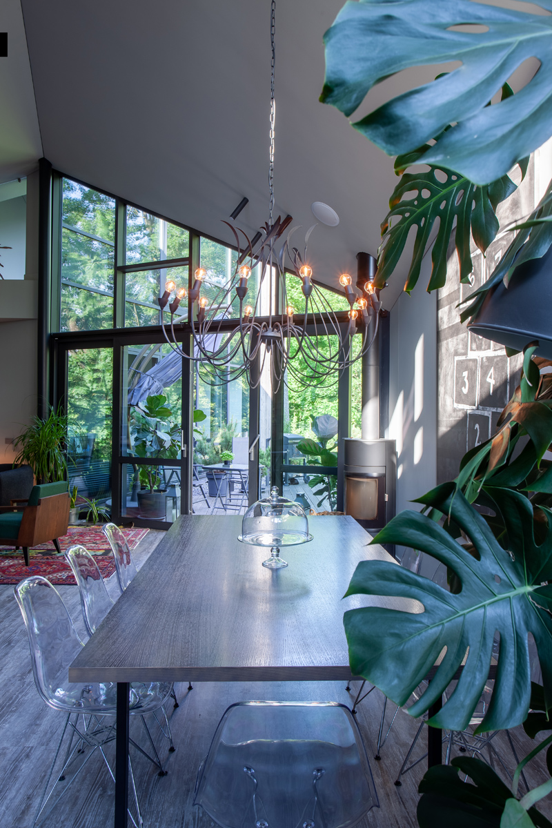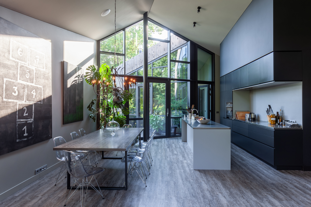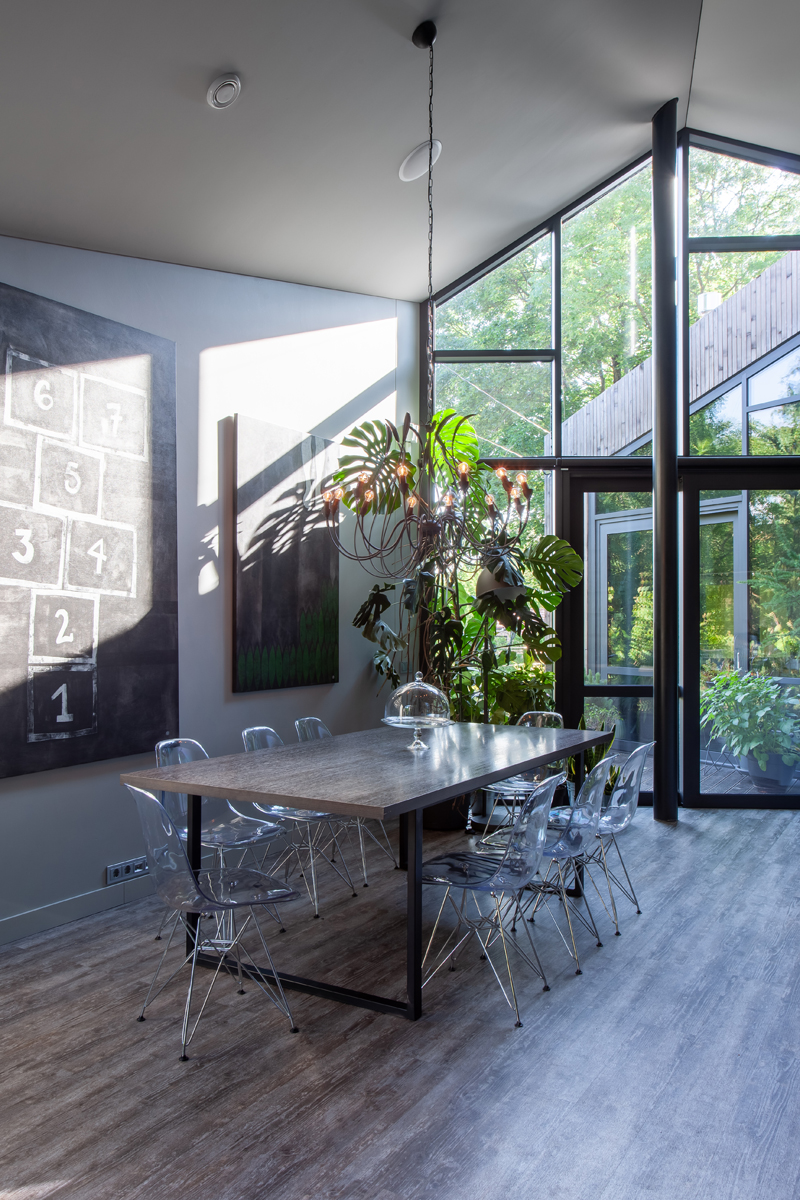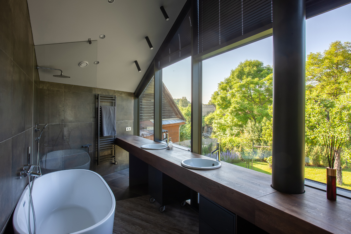 Namą projektavome bendromis pastangomis su vyru ir architekto Gintauto Natkevičiaus komanda. Interjere įgyvendinti tam tikrus funkcinius sprendimus padėjo architektų patirtis. Mes pageidavome turėti milžinišką biblioteką per visą sieną, virtuvės salą su plieniniu stalviršiu, didelius langus šviesai skleisti, kad augalai vešėtų, šlaitinį namo stogą ir specialią vietą mano talismanui – XIX a. bufetui.