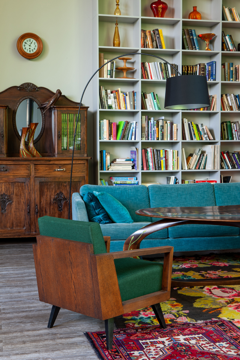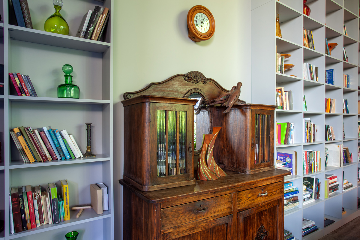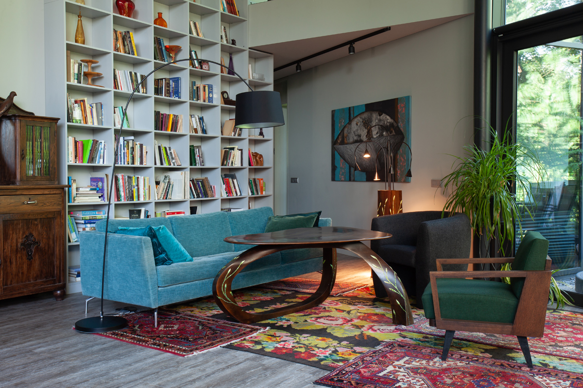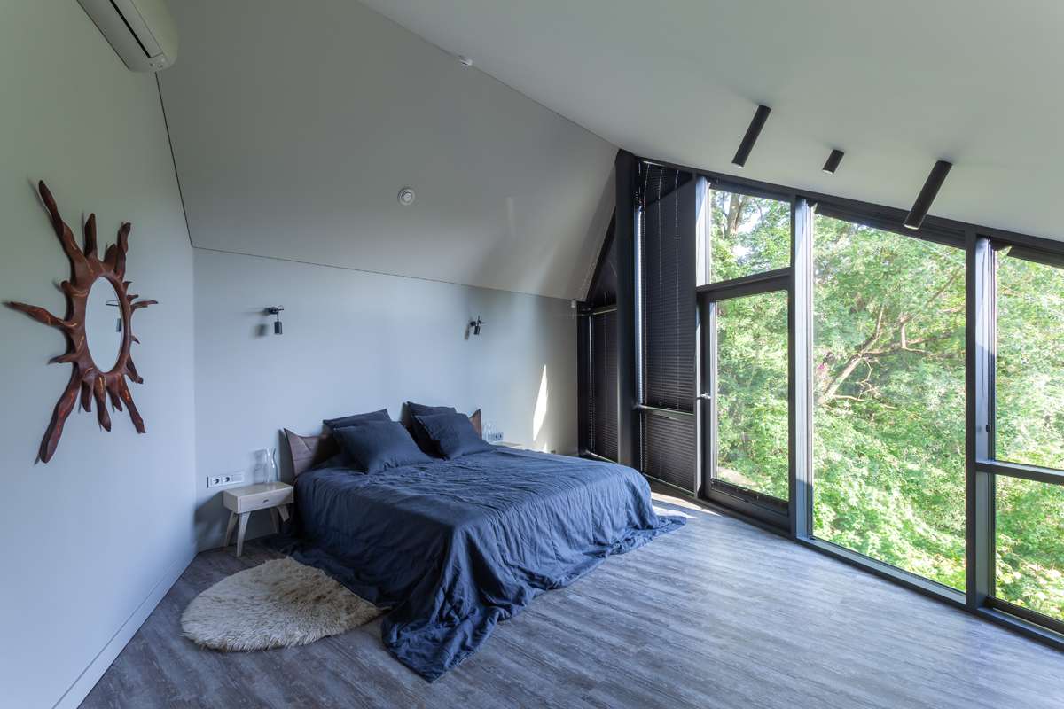 Namą projektavome bendromis pastangomis su vyru ir architekto Gintauto Natkevičiaus komanda. Interjere įgyvendinti tam tikrus funkcinius sprendimus padėjo architektų patirtis. Mes pageidavome turėti milžinišką biblioteką per visą sieną, virtuvės salą su plieniniu stalviršiu, didelius langus šviesai skleisti, kad augalai vešėtų, šlaitinį namo stogą ir specialią vietą mano talismanui – XIX a. bufetui.