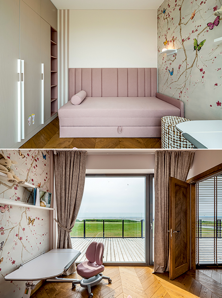 Vaiko erdvė – mažos mergaitės pasakų ir svajonių oazė su nuostabiu horizontu pro langą. Interjeras šviesiai skaidrus, pudros ir dūminės rožės tonuose, su mistifikuotais šviečiančiais akmenėliais ant sienos rožinėje drugelių pievoje. Baldai kurti šiai erdvei, o rašomasis stalas ir kedė pasirinkti, kad augtu kartu su mažąja kambario šeimininke.