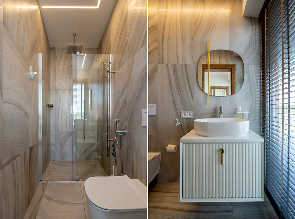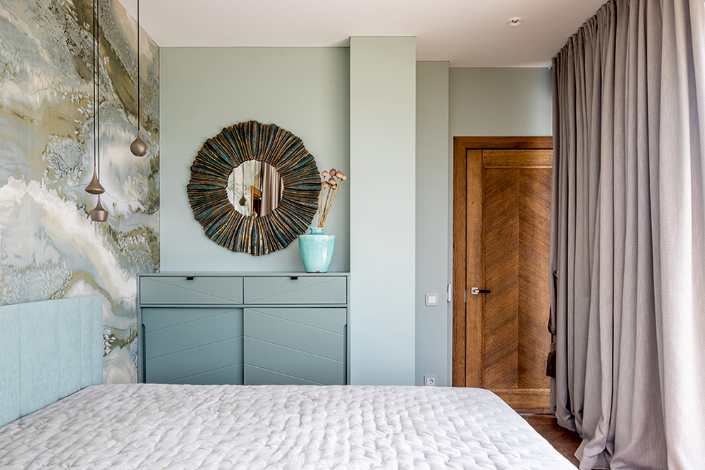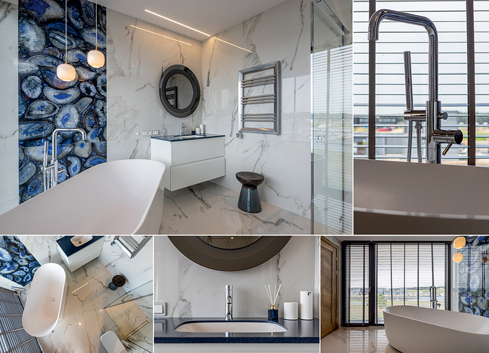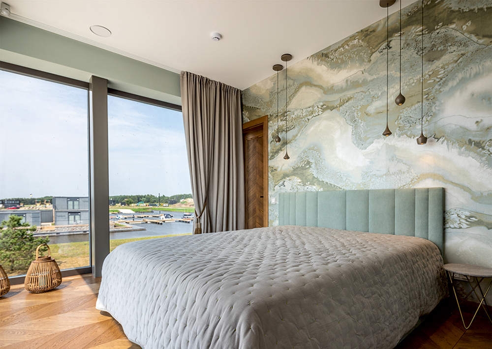 M i e g a m a s i s ir miegamojo didžioji vonia lengvuose vandens tonuose, kambariai atveriantys horizontus, su didžiuliais vitrininiais langais į vandenį, akvareliniais liejiniais ant sienos ir subtiliai atsikartojančiais gamtos motyvais dekoruose.