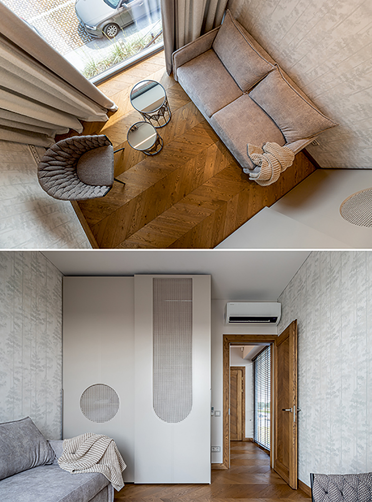 Laiptais pakylame į kitas poilsio zonas, miegamasis, vonios kambariai ir vaiko kambarys. Visi jie subtiliai ramūs su savitu koloritu, kuriantys atskiras istorijas: