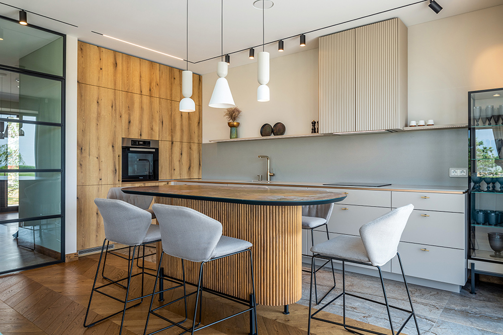 V i r t u v ė ir valgomasis šiuose namuos, sutelkia visų dėmesį aplink save. Pirmo aukšto erdvėje ji – ir valgomojo, ir svetainės dalis – funkciška, bet nesubuitinta, pasirenkant netipines ir kontrastuojančias medžiagas: žalvario stalviršis saloje, akmuo, medis, dūminis stiklas, saikingas auksas detalėse…