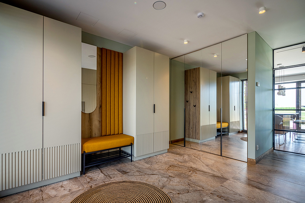 Įėjus pro lauko duris atsiduriame erdviame hole, tai – pirmoji erdvė, į kurią patenkame vos pravėrę namų duris. Daug dėmesio baldinės dalies sprendiniuose, šioje patalpoje sutalpintas visas namų ūkis, skalbimo zona, šildymo ir vėdinimo įranga, elektros instaliacijos spinta, bet jie taip ir lieka nepastebėti, už uždangų, kurios oragniškai susijungia kaip baldinė ir kaip dekoratyvioji dalis, sukurdamos stilingą estetinį paveikslą. Vertikalūs linijiniai akcentai stilizuotose balduose, organiškai akmens gijomis išmarginta grindų keramika, žalsvi, smėlio, turkio, ochros tonai su kontrastuojančiom juodom detalėm. Ant didžiulės sienos atsiranda tapybiški modernūs gamtos fragmentas, su kabančiomis šermukšnių kekėmis turkio pievoje tarsi įžanga į kitas namų erdves. Be funkcinio šios erdvės apšvietimo , parinktas ir šiek tiek simbolikos įnešantis vieno iš Europos apšvietos dizaino lyderių šviestuvas, kur šviestuvo pagalba, per formos organiką, funkciją ir meninė išraišką, išspręsta ne tik šviesos sklaida, bet ir prie vandens esančių namų sąsaja su gamta, kuris neabejotinai sukuria jaukumo atmosferą…