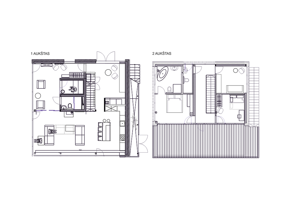 Bendroje pirmojo aukšto zonoje atsiranda baldinis suskirtymas: virtuvė, valgomasis, svetainė bei poilsio spa zona.