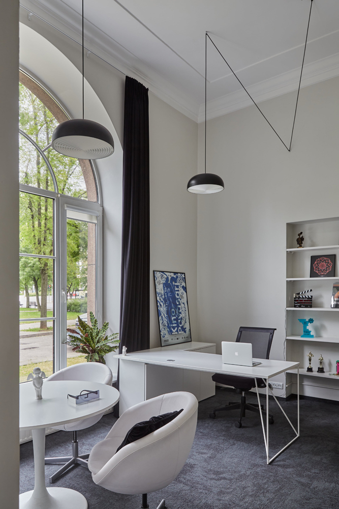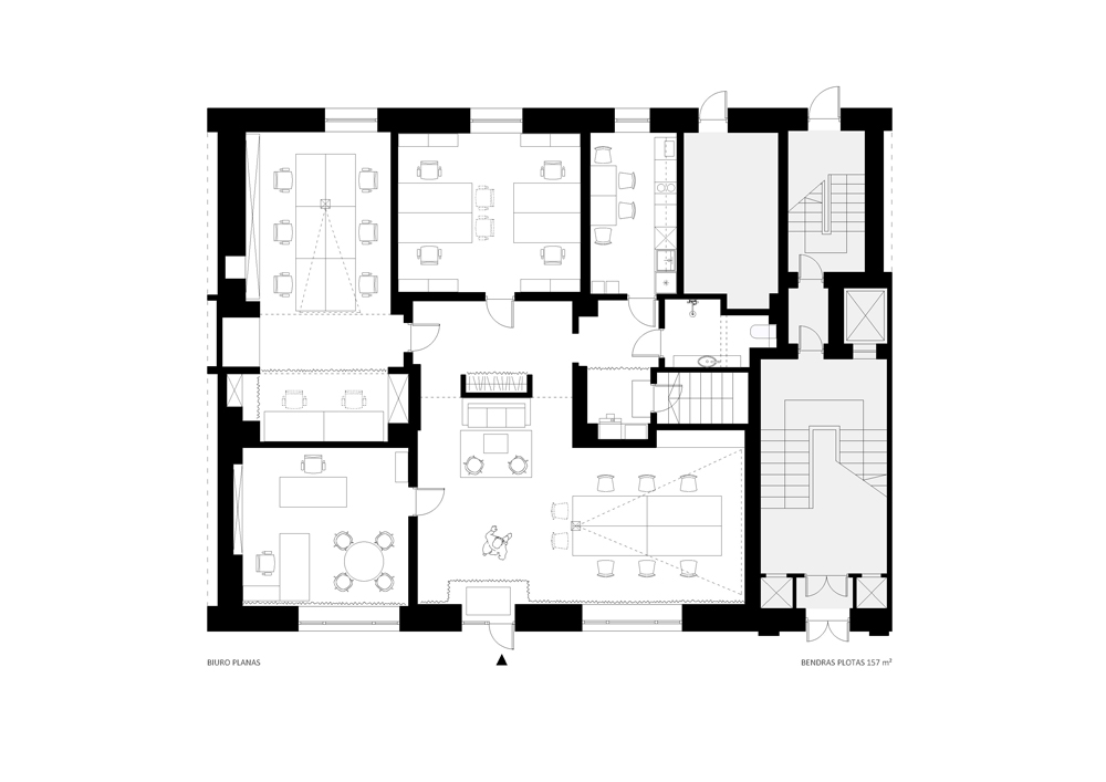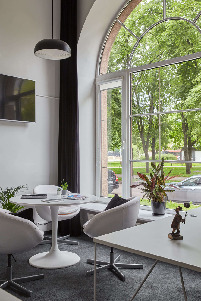 Biuras suskirstytas į dvi erdves – darbo ir bendravimo. Kabinetuose, kuriuose praleidžiama daugiausia darbo laiko ir reikia susikaupimo, parinktos šviesios sienų ir baldų spalvos, kiliminė danga garsui sumažinti.