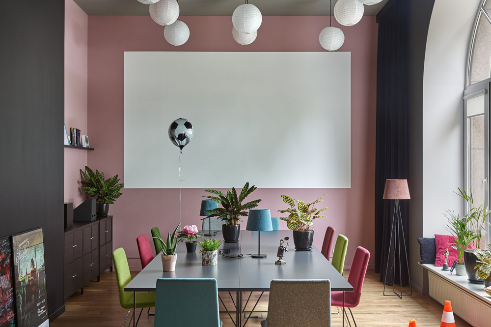 Kuriant šio biuro interjerą, pagrindinis uždavinys buvo sukurti erdves bendrauti, dirbti ir žiūrėti filmus. Įrengiant biurą buvo siekiama tvariai naudoti jau turimus baldus, papildant jį tik būtiniausiais daiktais.
