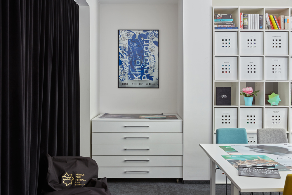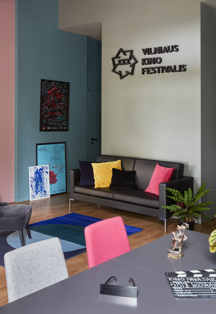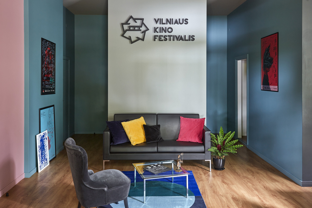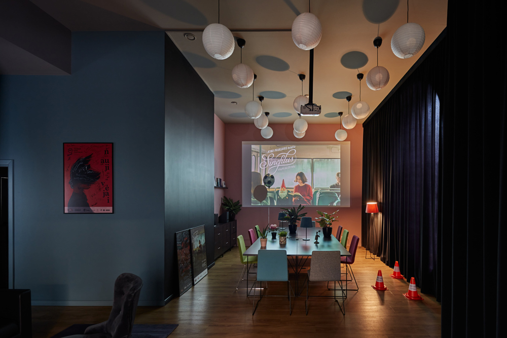 Kitokia atmosfera kuriama bendroje erdvėje, kuri skirta susitikimams, renginiams ir filmų žiūrėjimui. Įvairiomis spalvomis dažytos sienos, spalvoti baldai, juodos užuolaidos, žaismingos detalės ir plakatai ant sienų kuria šioje erdvėje kino festivalio nuotaiką.