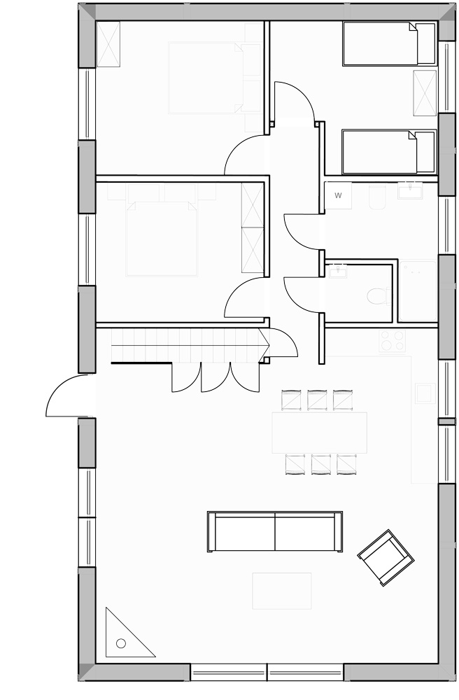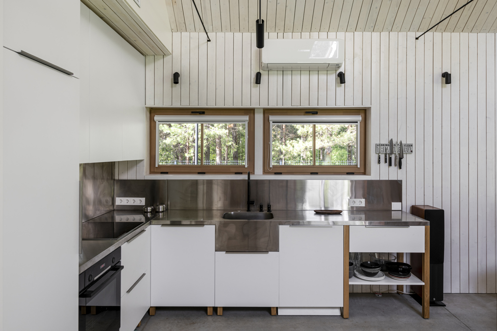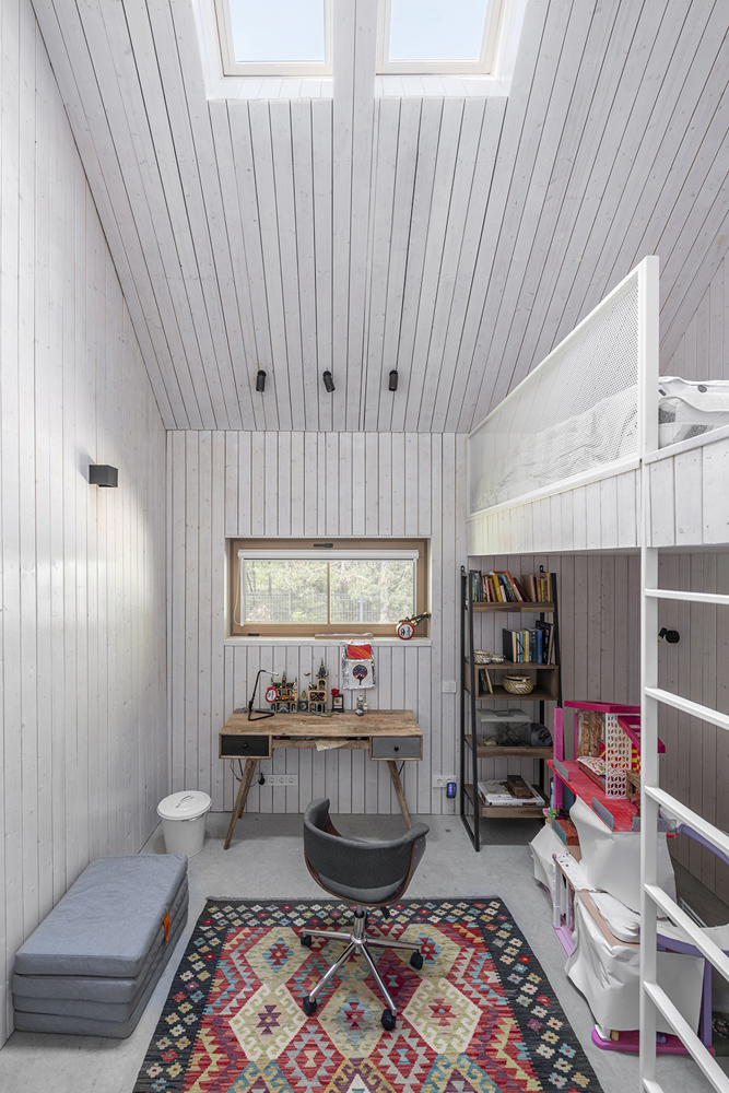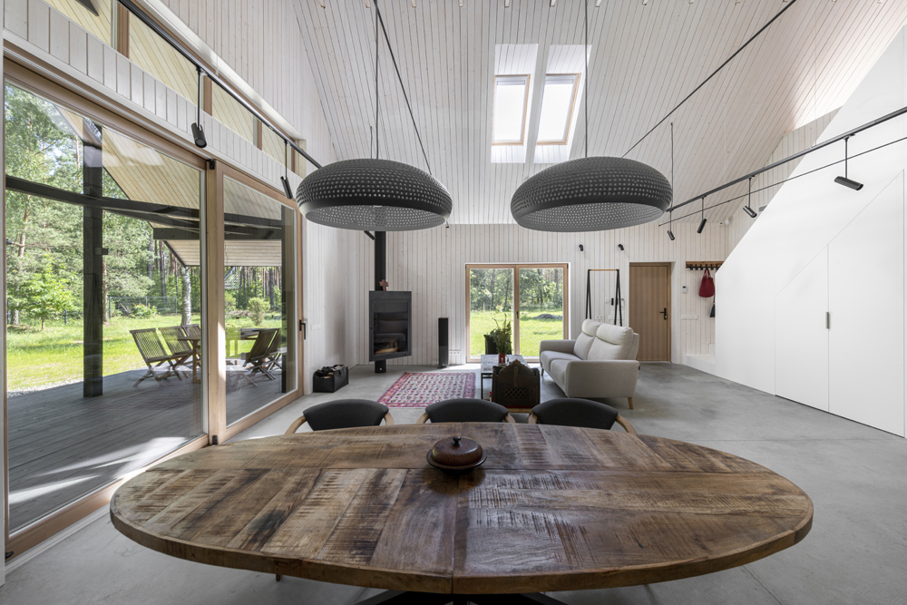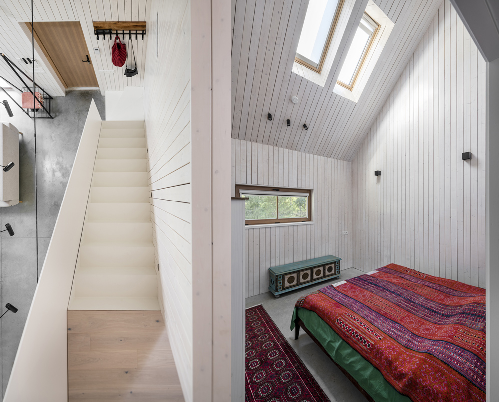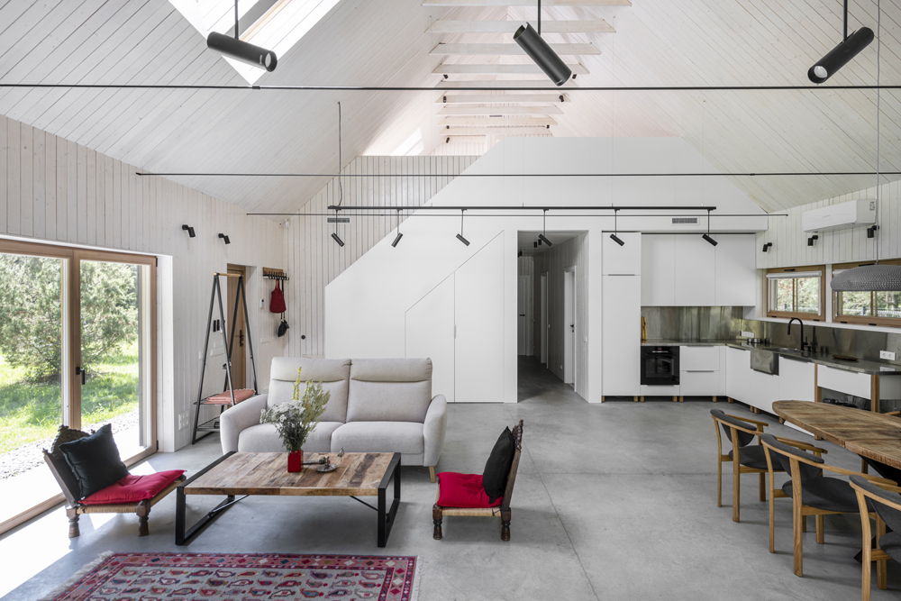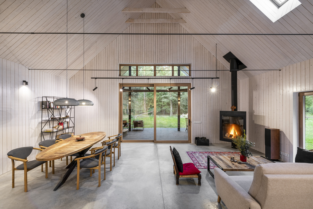 Dzūkijos miškuose esančioje senoje sodyboje suprojektuotas poilsio namas. Tai netrikdantis aplink plytinčių miškų ramybės bei atliepiantis archaiškos architektūros parko reikalavimus pastatas. Tuo pačiu tai naujos kokybės ir šiuolaikinės estetikos architektūra. Fasade -deginto medžio ir tradicinių raštų ant metalo langinių dermė. O kaip kontrastas juodai išorei – baltumu ir lengvumu alsuojantis vidus.