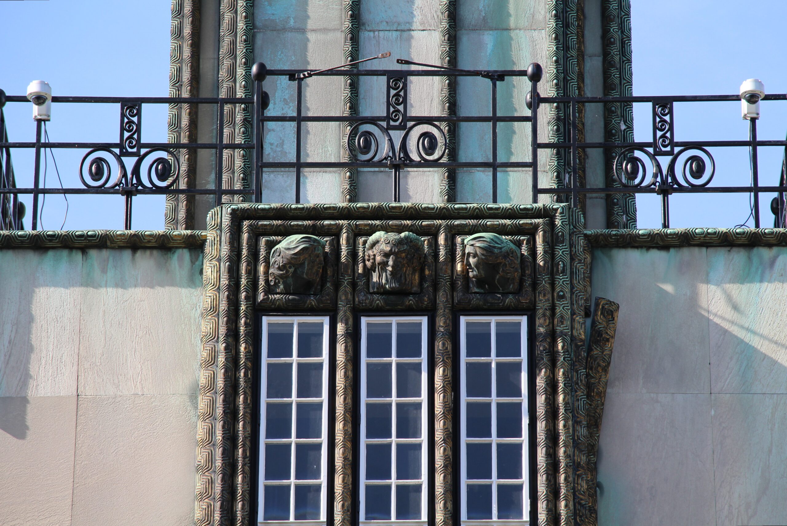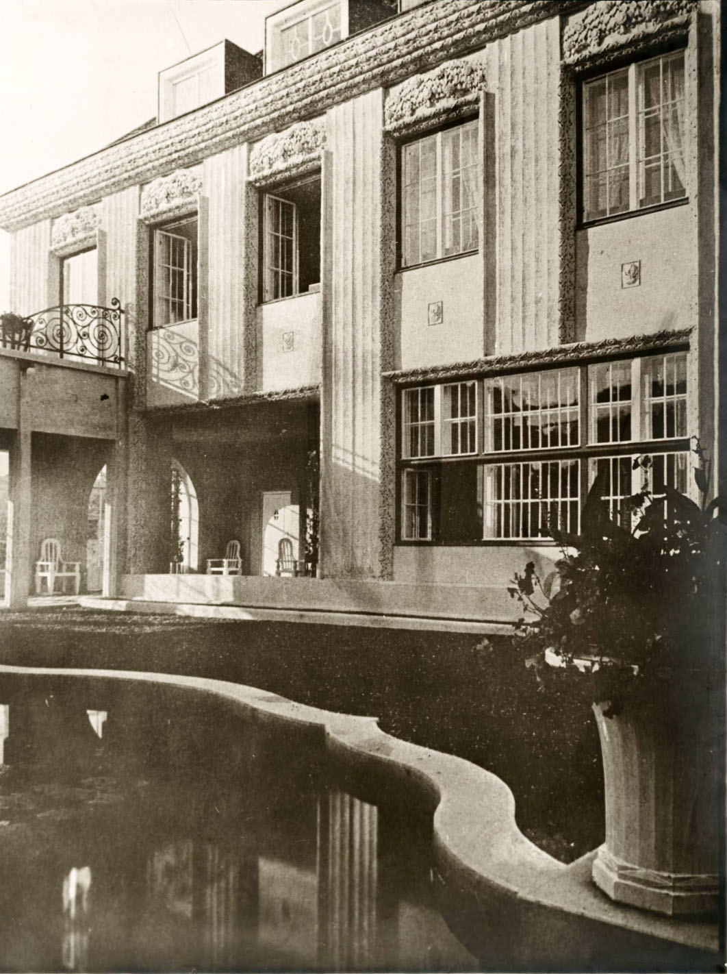 Kairėje: Purkersdorfo sanatorijos fasado fragmentas. Dešinėje: Purkersdorfo sanatorijos salono interjeras, 1904 m.