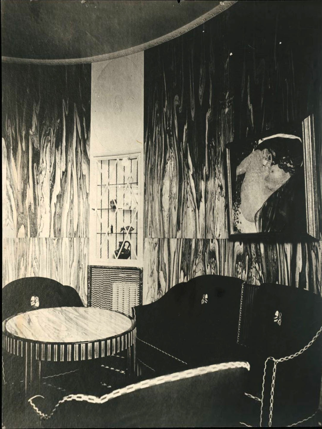 Kairėje: J. Hoffmanno surengtos Secesiono ekspozicijos Pasaulinėje Paryžiaus parodoje fragmentas, 1900 m. Dešinėje: „Wiener Werkstatte“ salono Vienoje interjeras, 1904 m.