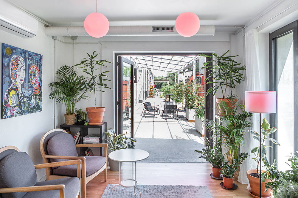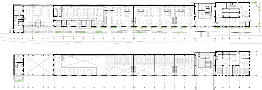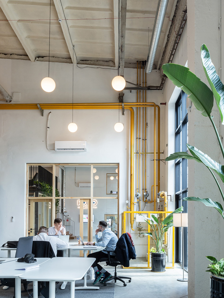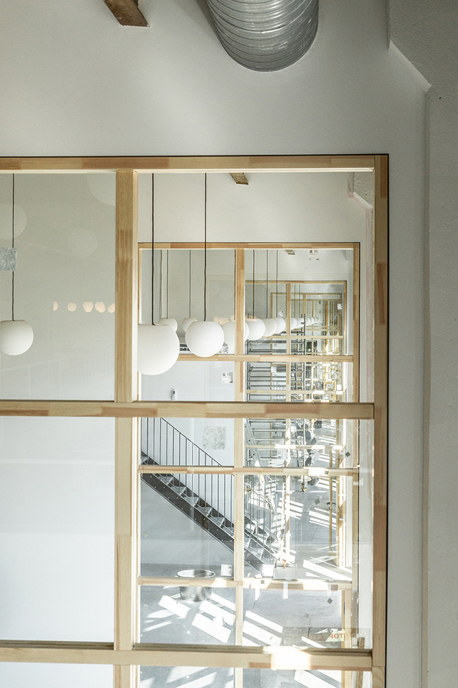 Siekiant užtikrinti patogią darbo aplinką, didelės patalpos buvo padalintos į kelis mažesnius biurus išilgai atviro fasado, užtikrinančio nuolatinę natūralią dienos šviesą. Visos patalpos yra vizualiai sujungtos vienos su kitu per įstiklintą langą, esantį toje pačioje vietoje plane, todėl sukuriamas savotiškas erdvinis tunelis su nenutrūkstamu vaizdu per beveik visą pastatą.