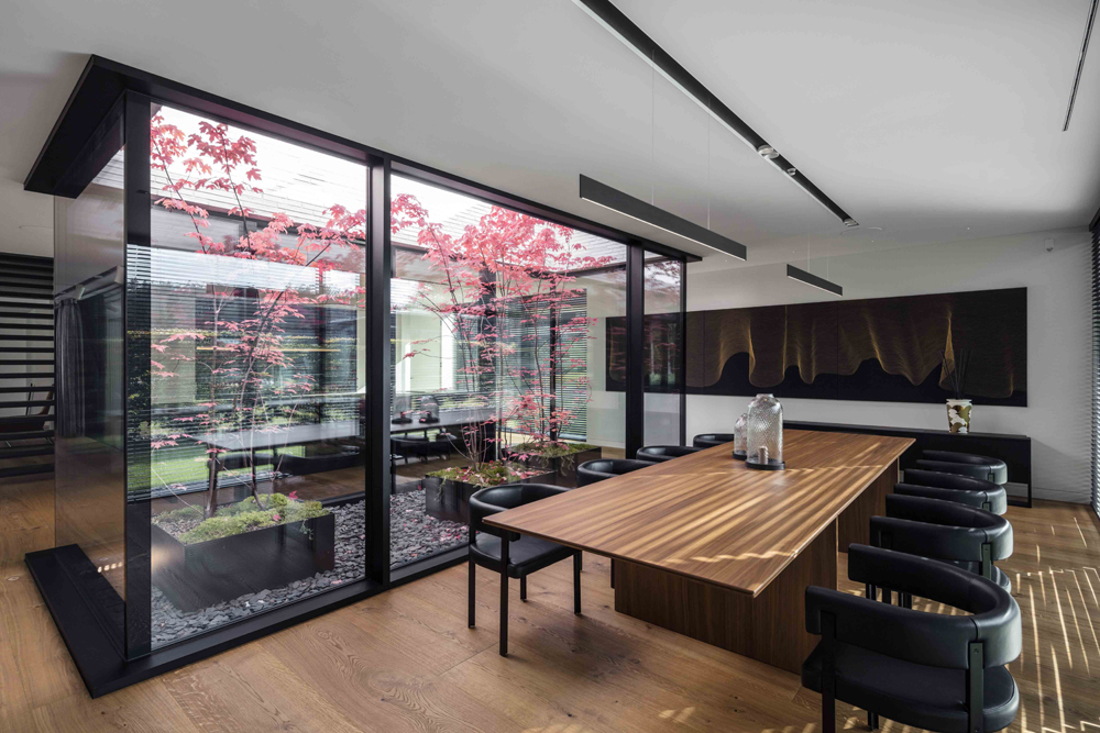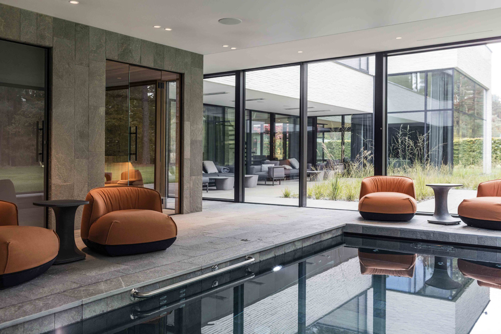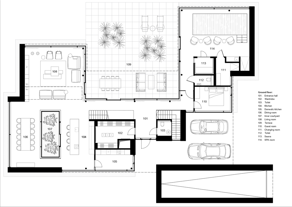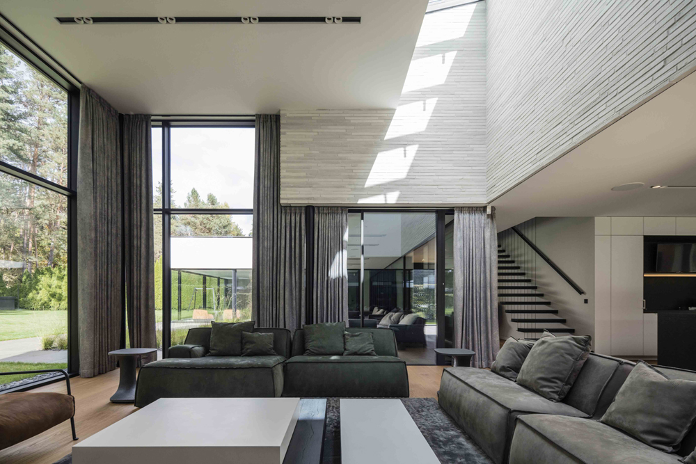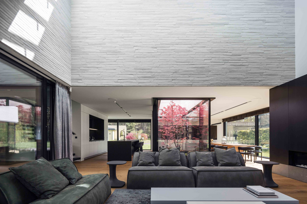 Namas įsikūręs nedideliame Vilniaus priemiesčio kvartale, gamtinėje aplinkoje. Projektuojant pastatą, uždaras fasadas tikslingai orientuotas į gatvę, o atvirasis – nukreiptas į gamtą. Čia įrengta ir dengta kiemo terasa. Preciziškai sudėliota planinė struktūra yra trijų lygių: požemyje – parkingas, pirmame aukšte – gyvenamoji ir spa zonos, antrajame – miegamieji kambariai. Švarios, modernistinės tūrio formos derinamos su šilta, rankų darbo plytų apdaila.