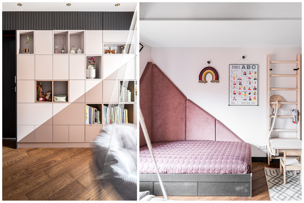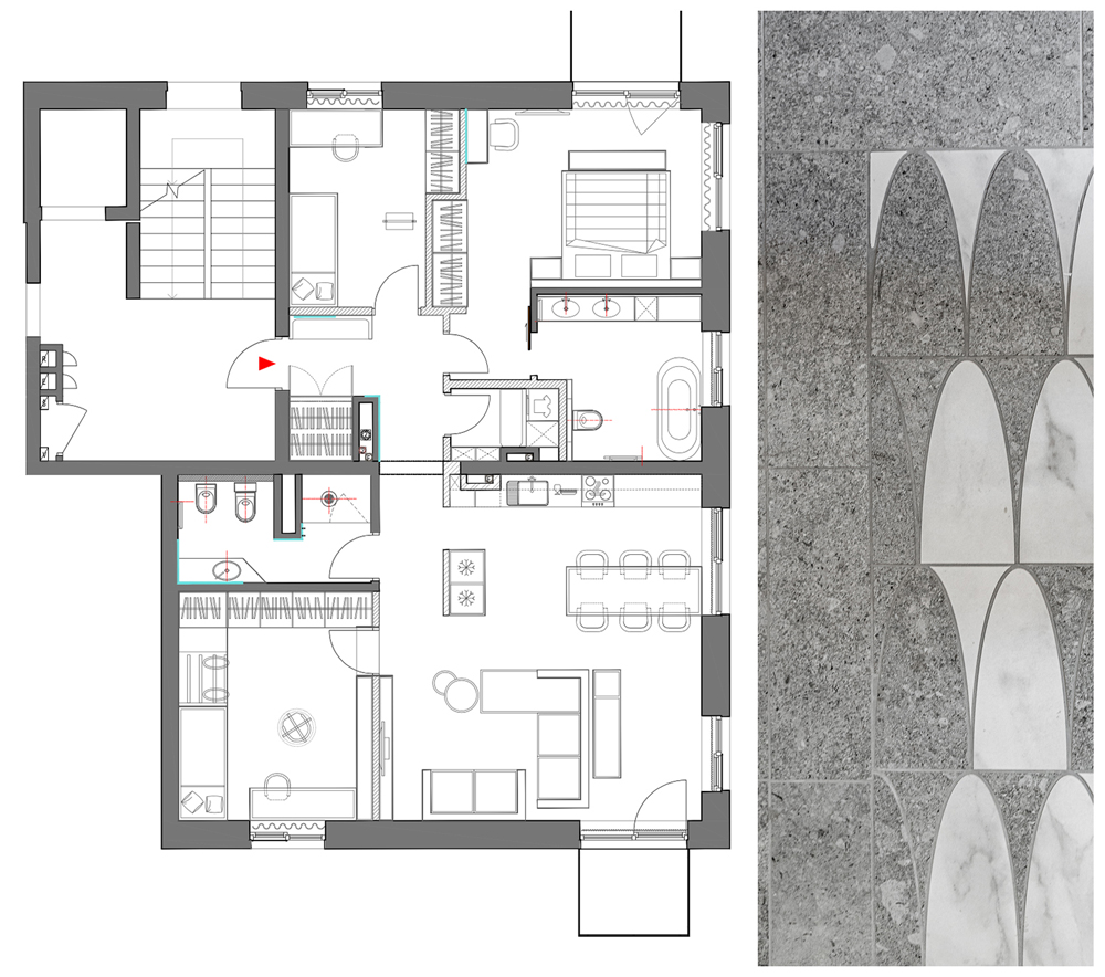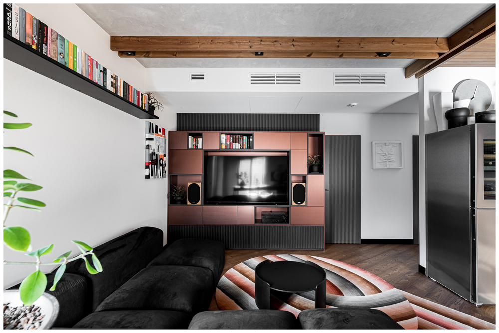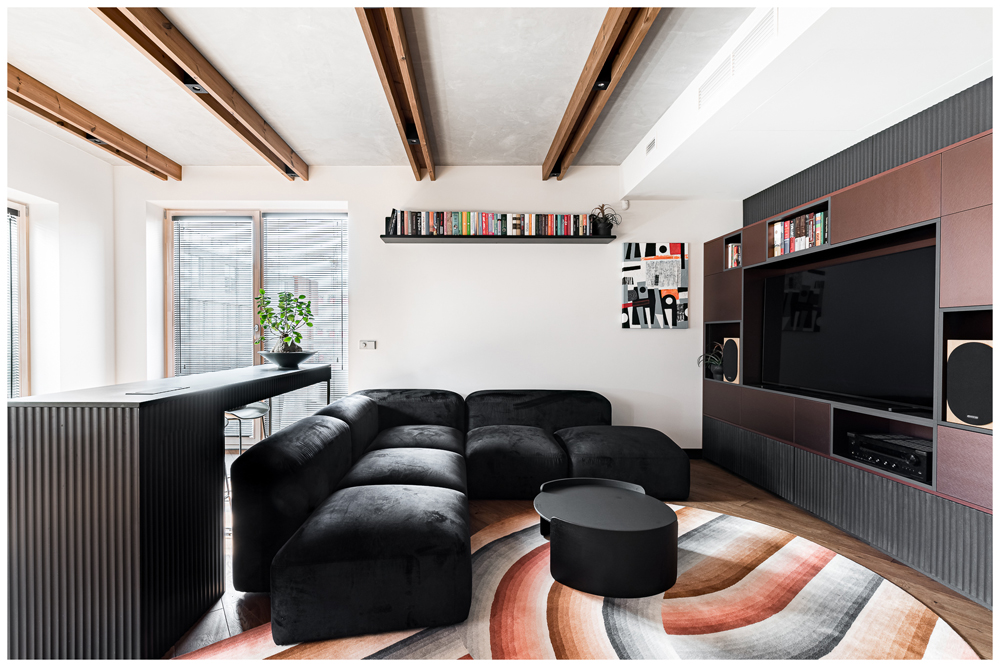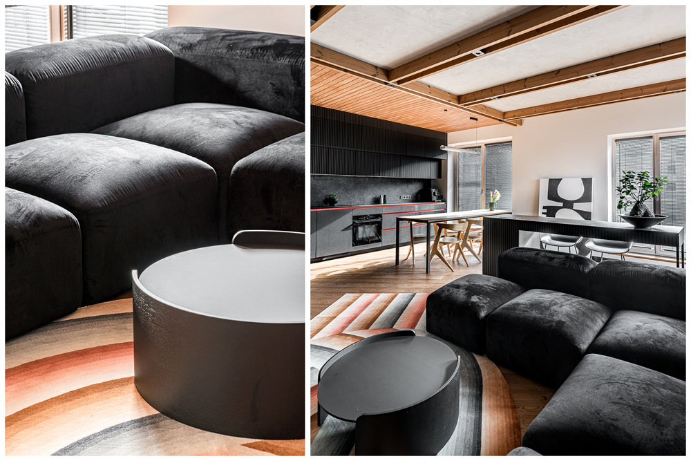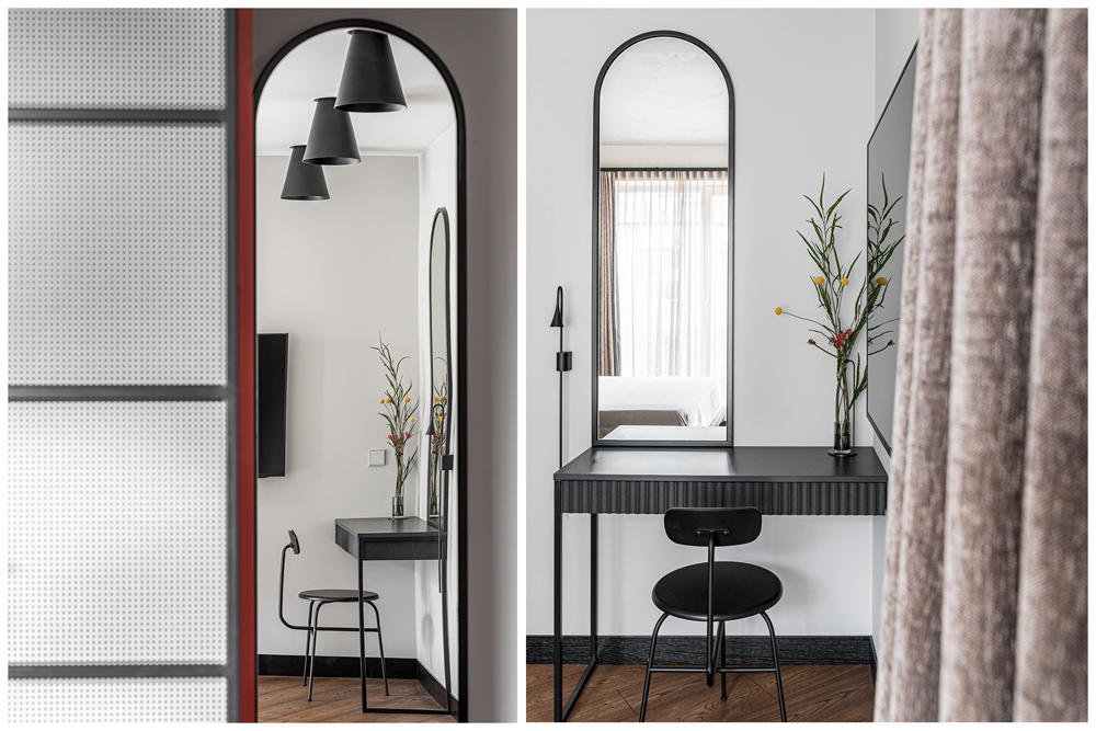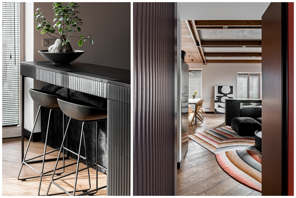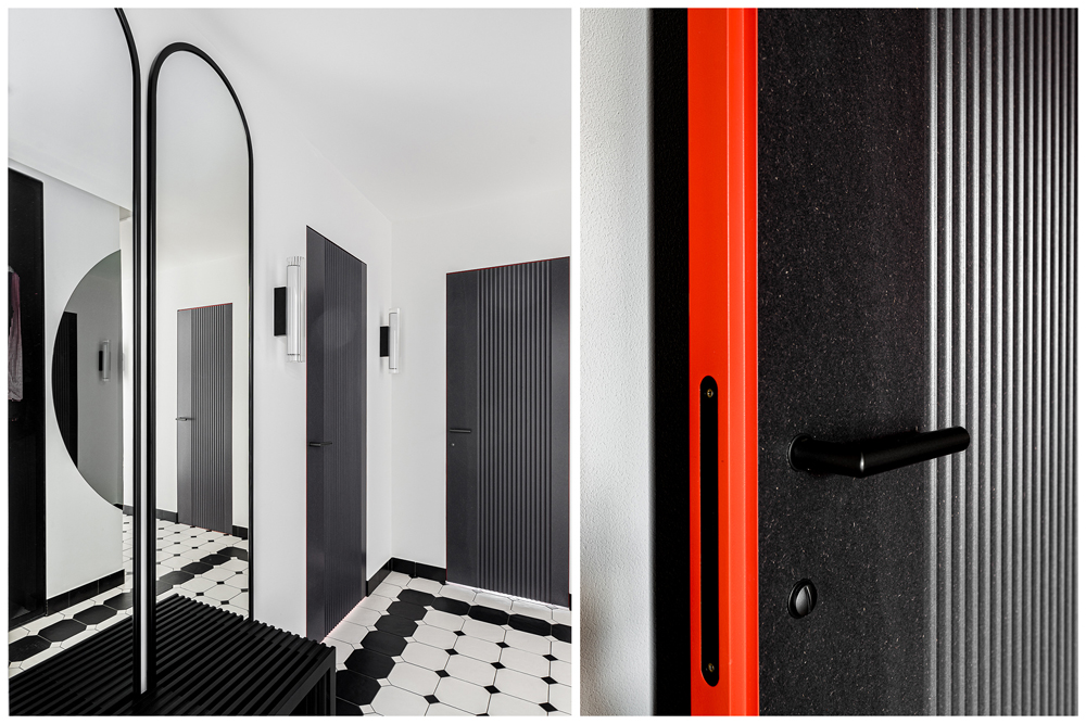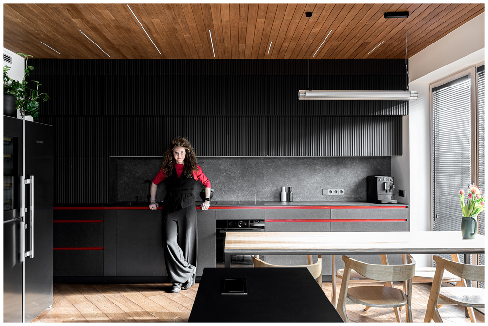 Visame interjere tarsi svarbiausia akcentinė detalė tampa raudona plona linija. Tiek virtuvės profiliuose, tiek durų kraštuose ji vis dar sugeba nustebinti ir padaryti interjerą vienintelį ir nepakartojamą.