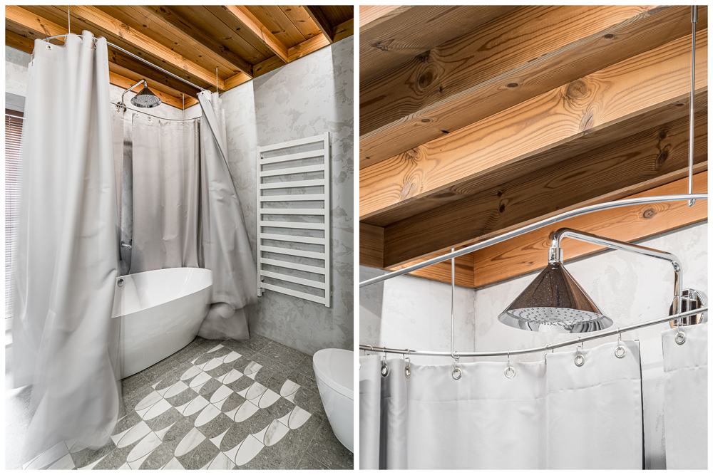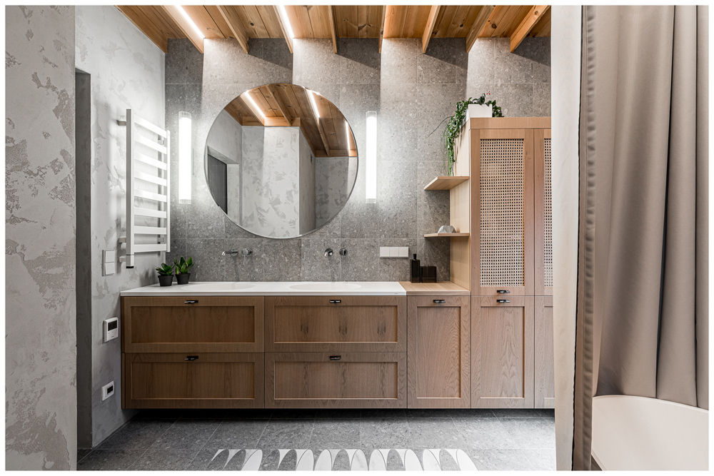Didžiosios vonios ir virtuvės lubos išklotos natūralia termo mediena, o svetainėje sumontuoti natūralios medienos balkiai su šviestuvais suleisti juose. Maksimalus lubų aukštis išsaugotas naudojant rankomis išteptą betoninį tinką tiek miegamajame tiek svetainės erdvėje, o vonios kambarių sienos puoštos apdailiniu molio tinku, kurio PH 8,19 – tai šarminė aplinka, kuri nepalanki atsirasti pelėsiui. Produktas yra visiškai pralaidus garams ir nesudaro plėvelės. Durys į kambarius, virtuvė ir baras pagaminti iš pagal specialų užsakymą frezuotos „Valchromat“ medienos plaušų plokštės. Plaušai impregnuojami organiniais dažikliais ir chemiškai surišami vienas su kitu naudojant specialią dervą, kuri suteikia unikalias fizines chemines savybes. Šviestuvai medinėse vonios kambario ir svetainės lubose suleidžiami į jas taip grakščiai parenkant ploniausias led juostas, tad šviesos šaltinis praktiškai nematomas ir sukuria magiškai malonų romantišką pojūtį.