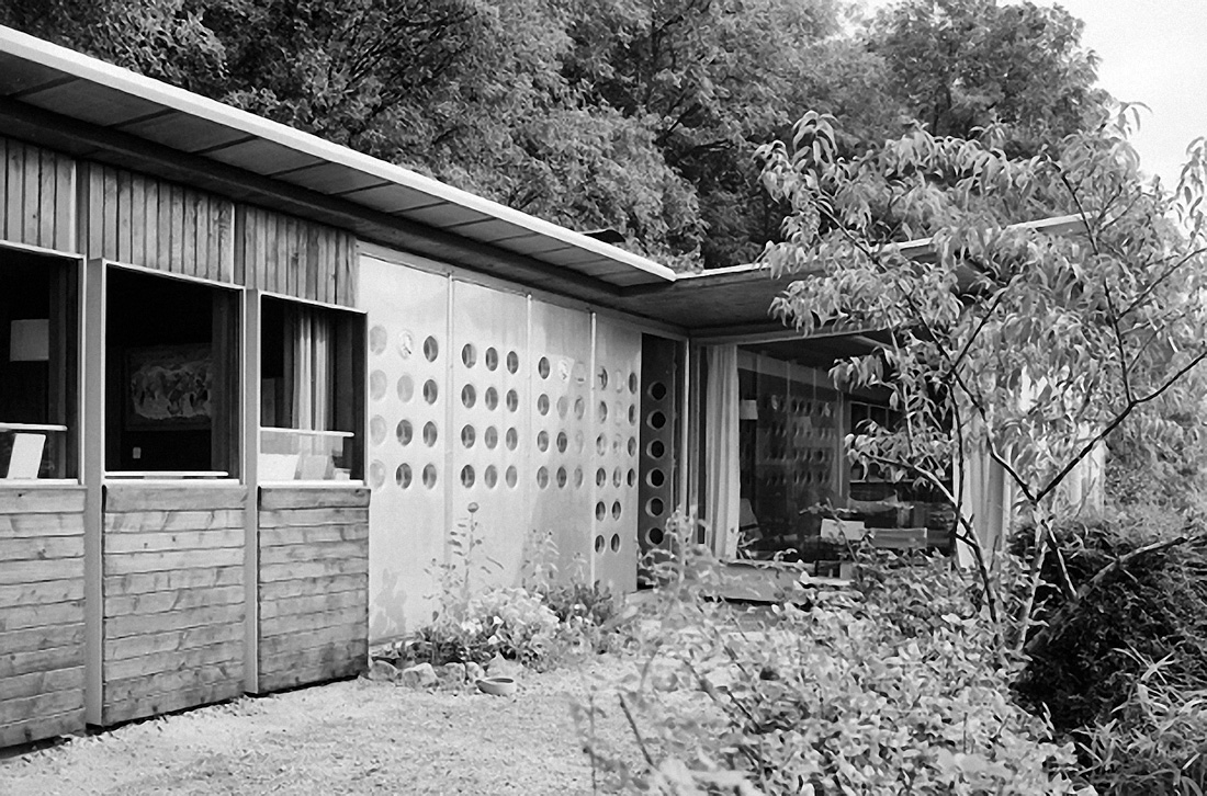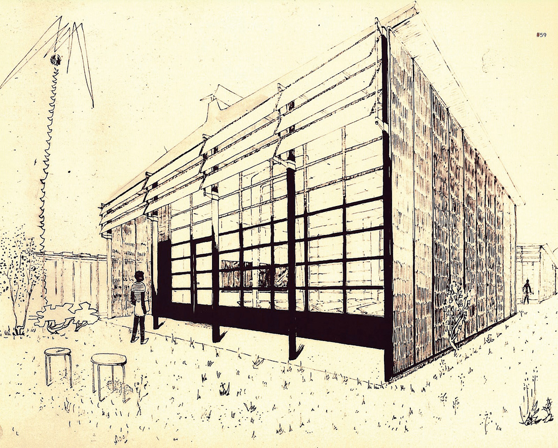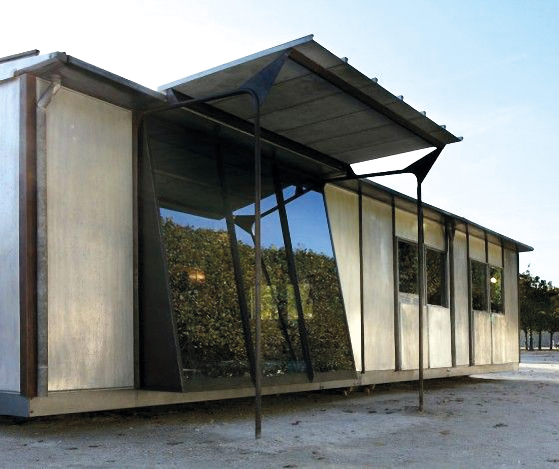 Gyvenamojo namo „Maison Jean Prouvé“ svetainė, 1953 m. Surenkamojo modulinio namo „Métropole fasadas, 1949 m.