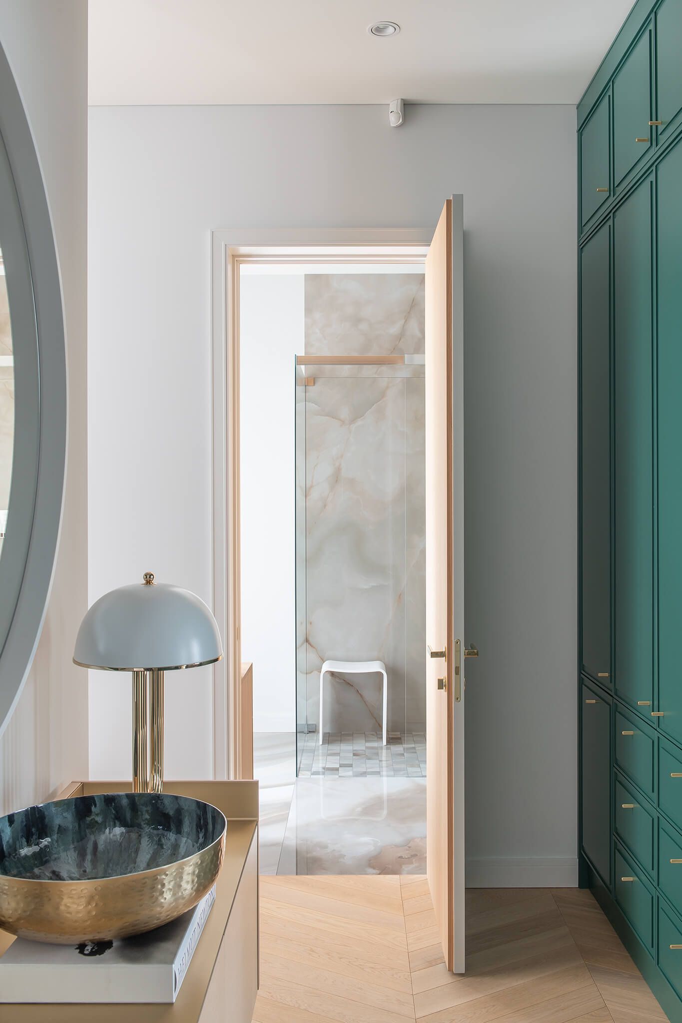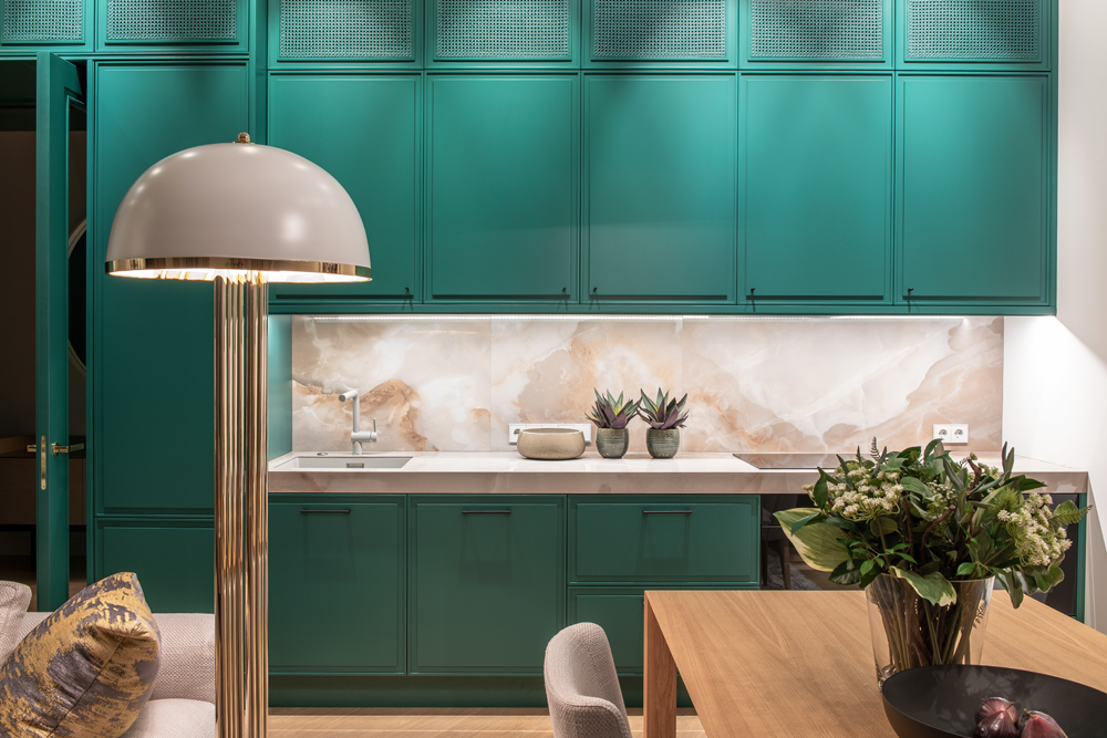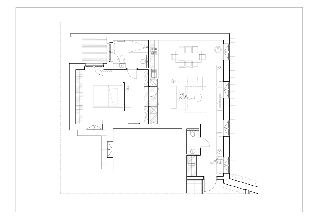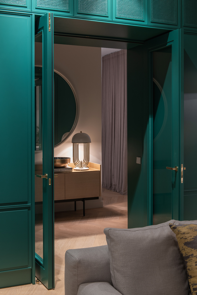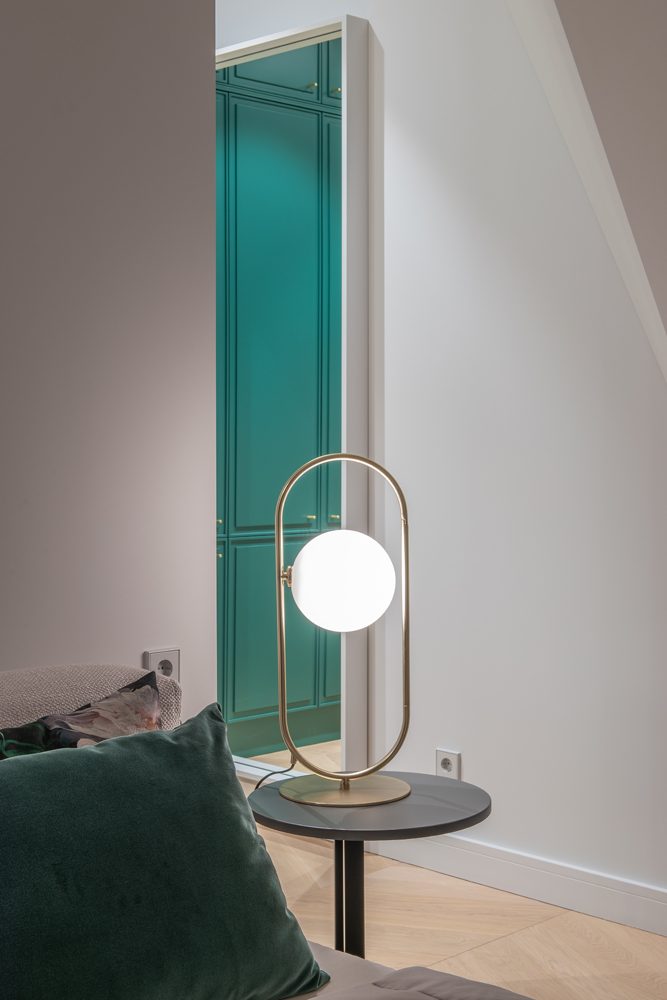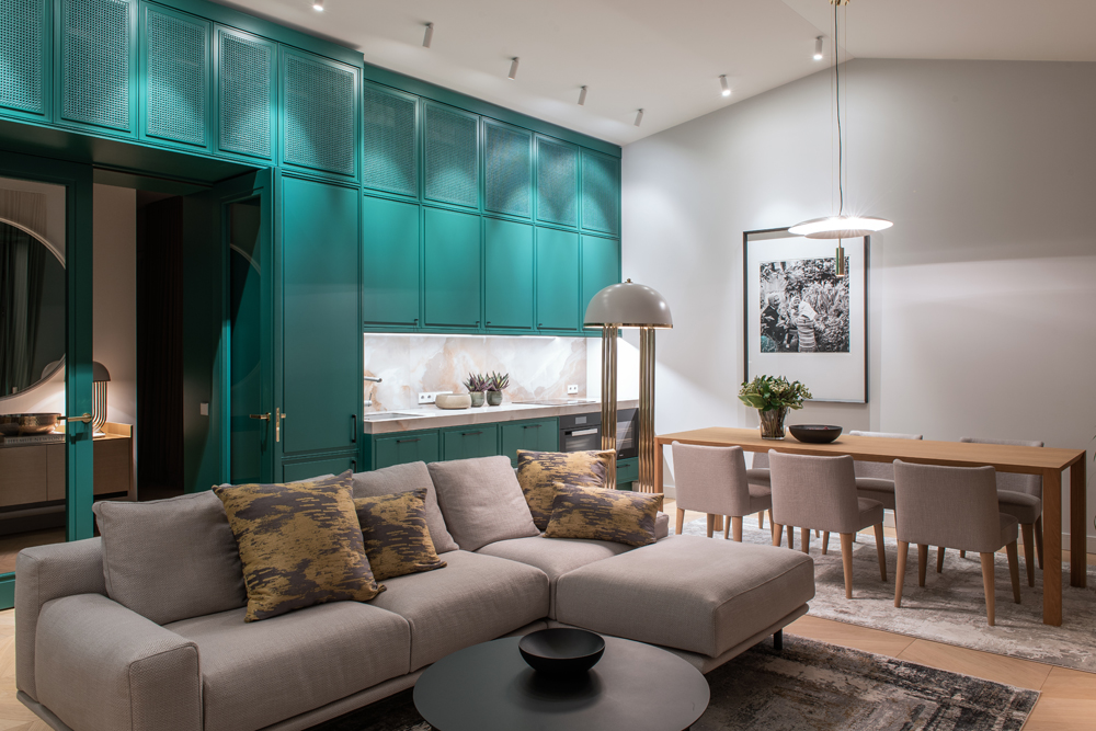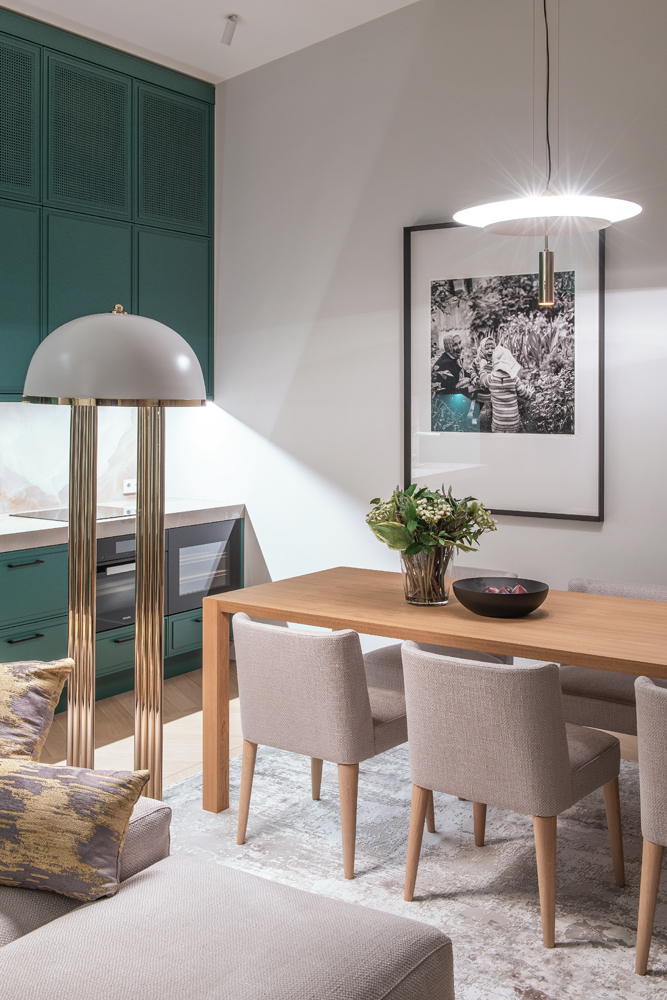 Projektas yra nuostabiame UNESCO pasaulio paveldo Vilniaus senamiesčio dalyje, todėl ir kurti jį buvo malonus iššūkis. Privalėjome gerbti šį palikimą ir istoriją nepaisant to, kad objektas yra naujai pastatytame name. Bendra objekto plotas ne mažas, tačiau šeimininkams tai būstas, skirtas poilsio savaitgaliams senamiestyje, o ne nuolatiniam gyvenimui, todėl ir poreikiai erdvių išplanavimui buvo orientuoti į jų gyvenimo būdą. Atviros erdvės tarp svetainės, valgomojo ir virtuvės tarsi baltas popieriaus lapas kėlė užsakovų lūkesčius namų funkcinėms zonoms taip projektą padarydamos įdomų ir sudėtingą – be fizinių sienų sukurti ir sujungti tris skirtingas zonas. Iš šio uždavinio ir gimė interjero kulminacija – aktyviai žalios spalvos multiplikacinis individualiai projektuotas baldas – siena ir jungiantis, ir skiriantis skirtingas funkcines zonas. Balde paslėpti visi svarbiausi buities prietaisai, sandėliavimas (kas leidžia visas erdves išlaikyti optiškai lengvas ir neapkrautas) ir dirbtinio vėdinimo mechanizmai.