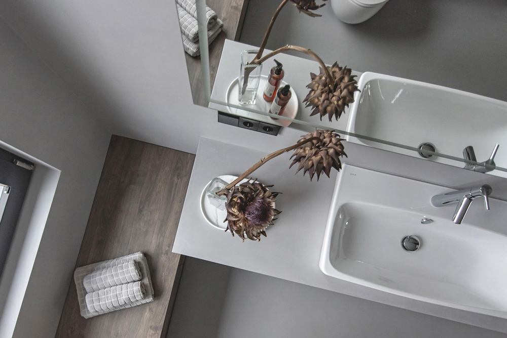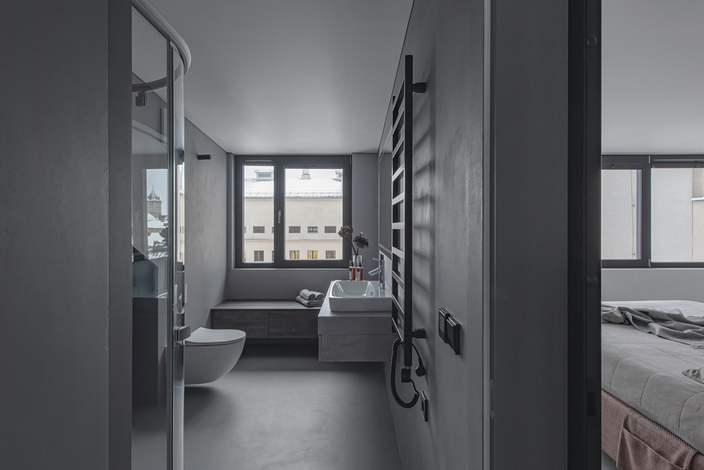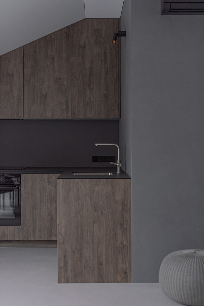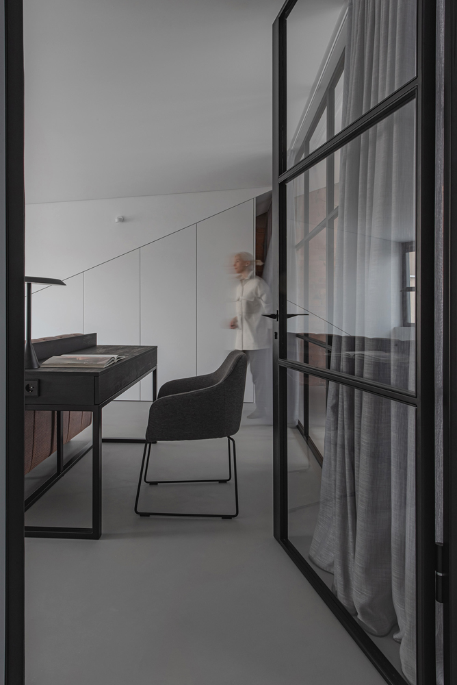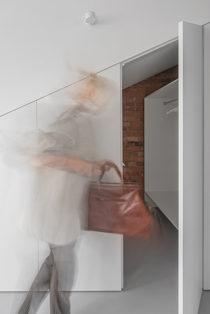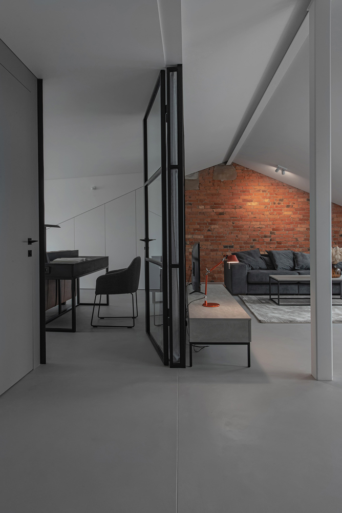 Tikslingai atsisakoma bet kokio dekoro, išnaudojant esamą senų raudonų plytų sieną kaip pagrindinį spalvinį akcentą. Kitos medžiagos neutralios, paliekant kuo švaresnę erdvę ir jos laužytas formas.