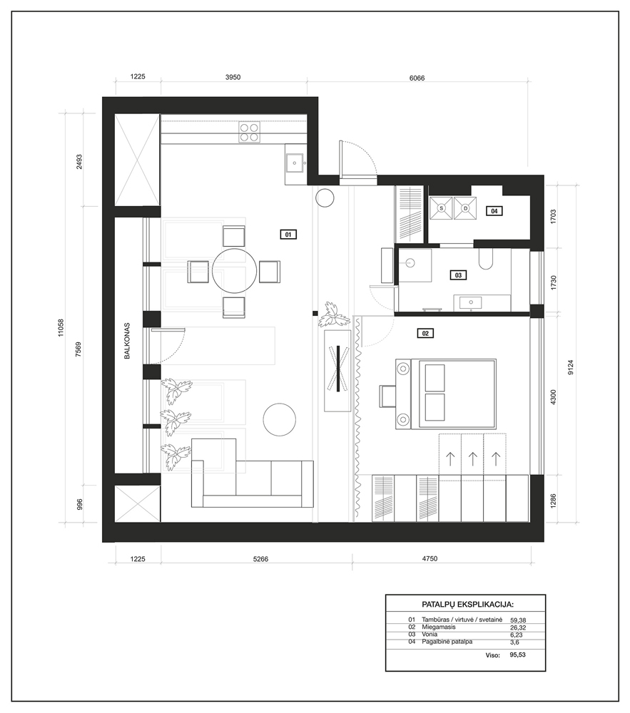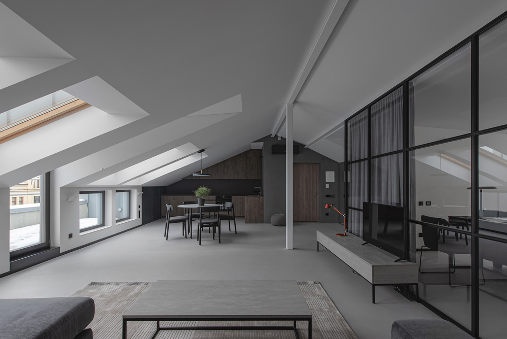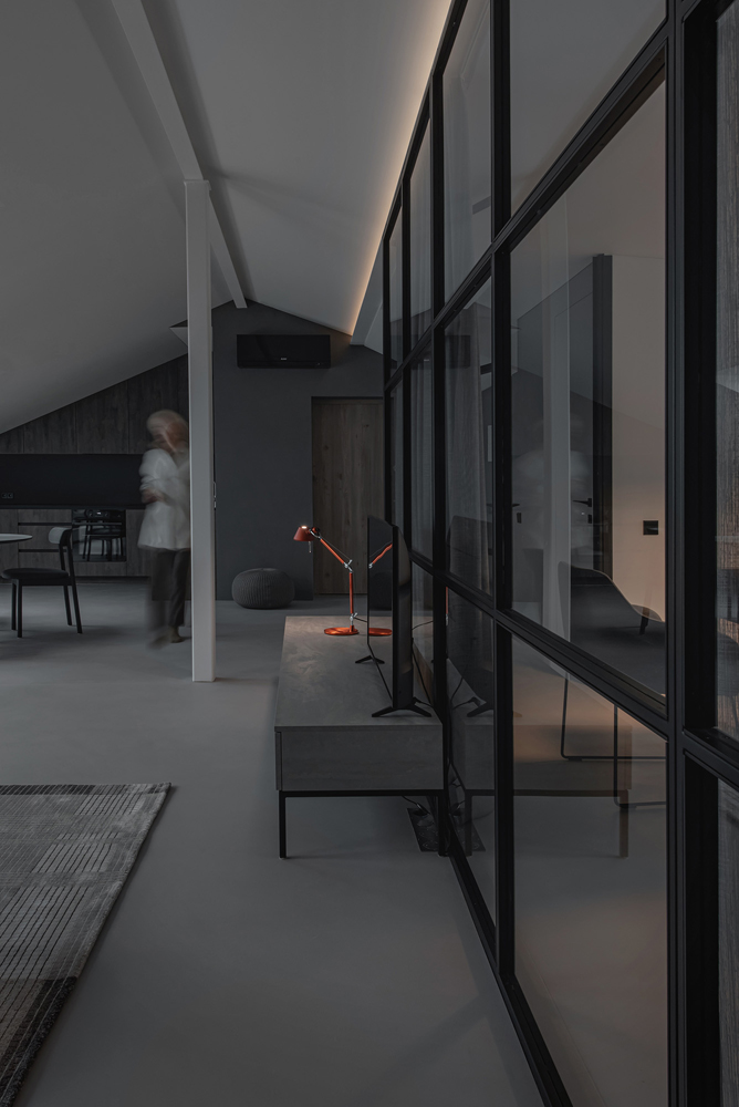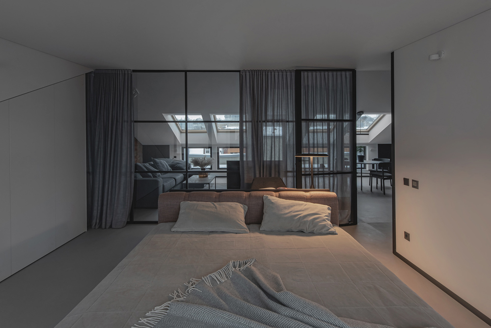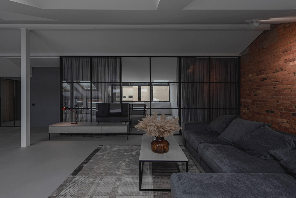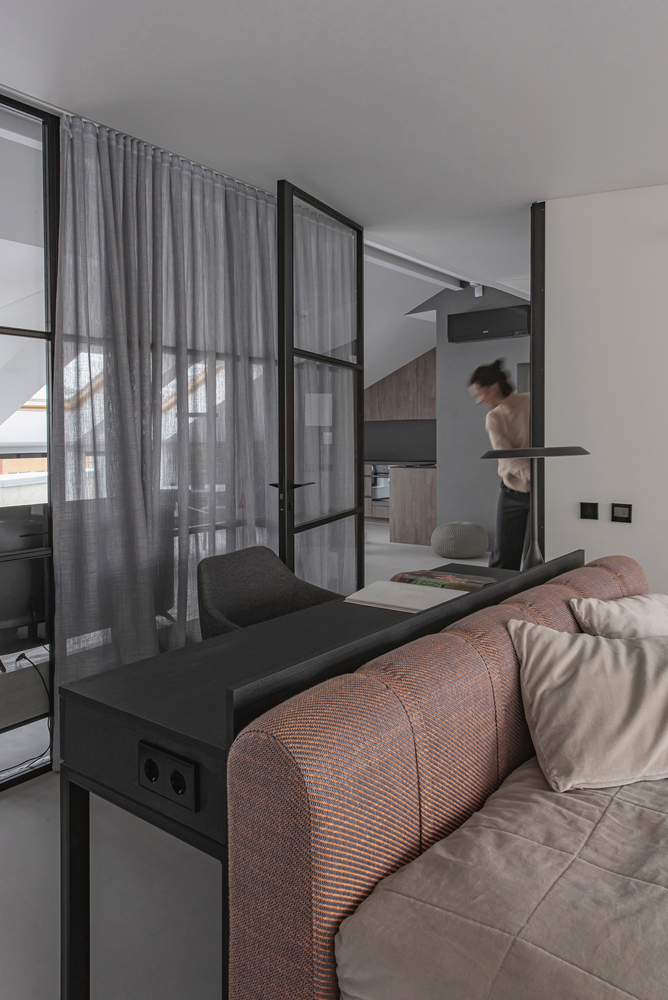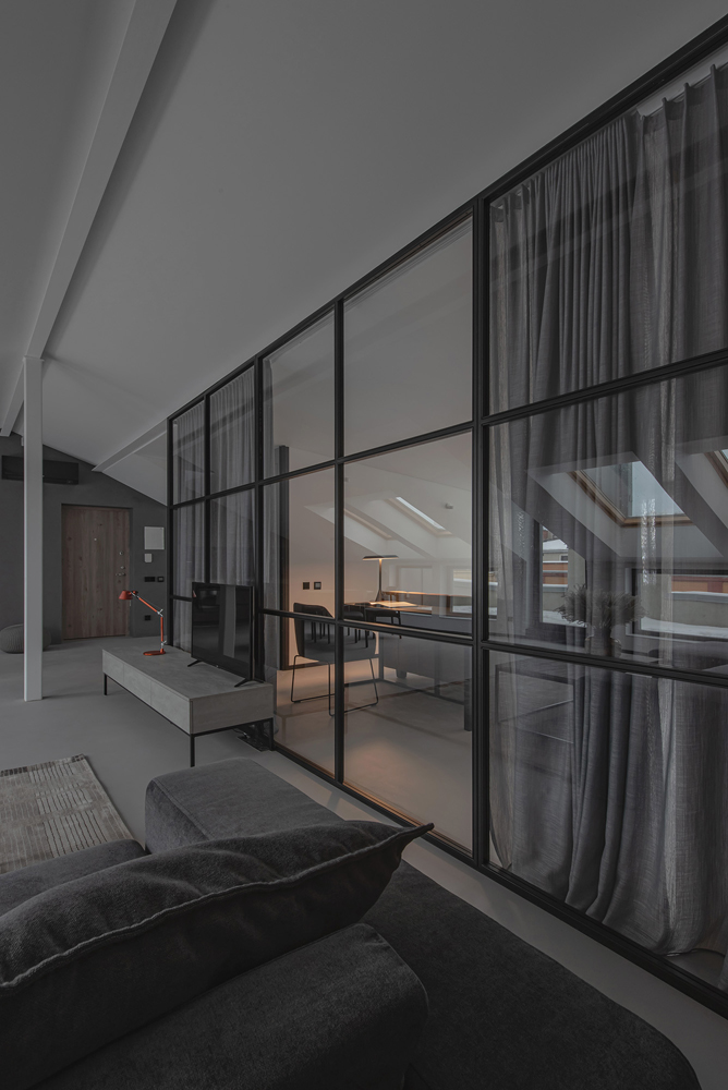 Projektavimo tikslas buvo patogus nedidelės erdvės funkcinių zonų išplanavimas, išsaugant kuo daugiau natūralios dienos šviesos. Suprojektuotos stiklo pertvaros leido atskirti skirtingas funkcines erdves jų neizoliuojant. Privatumui sukurti naudojamos lino užuolaidos.