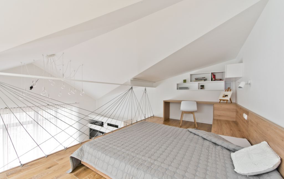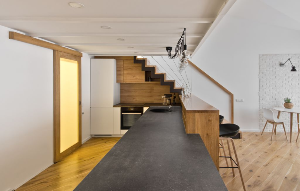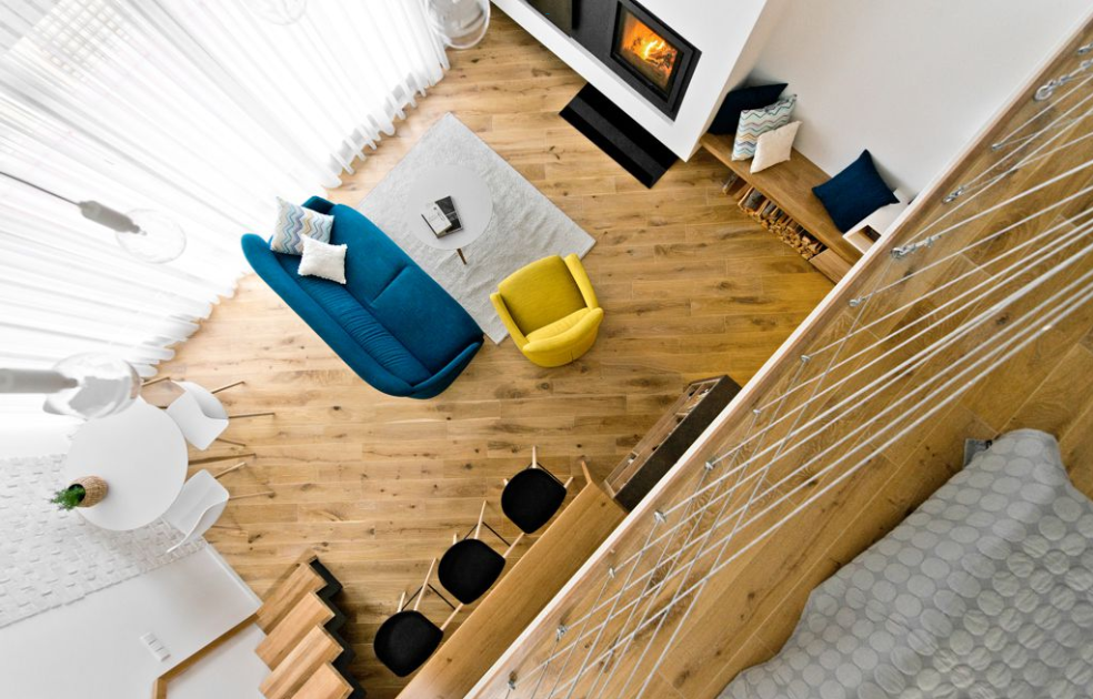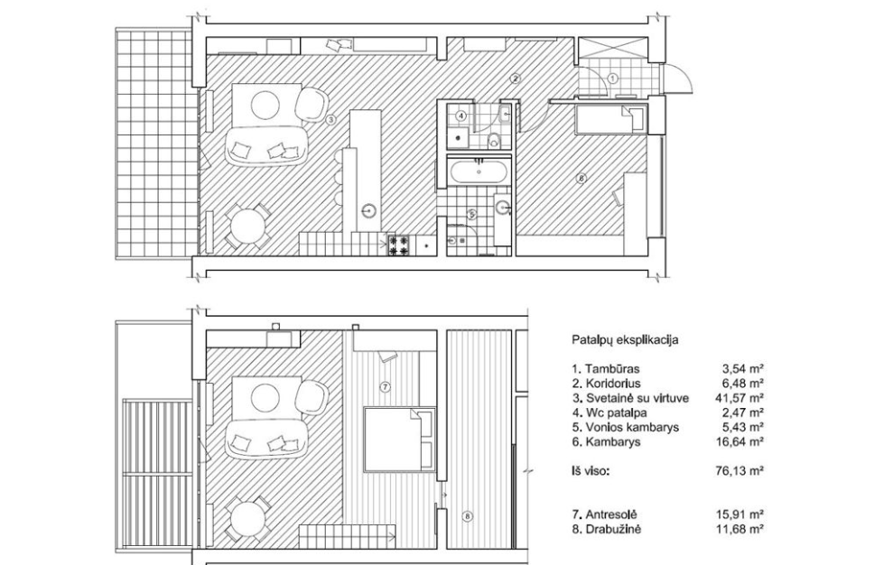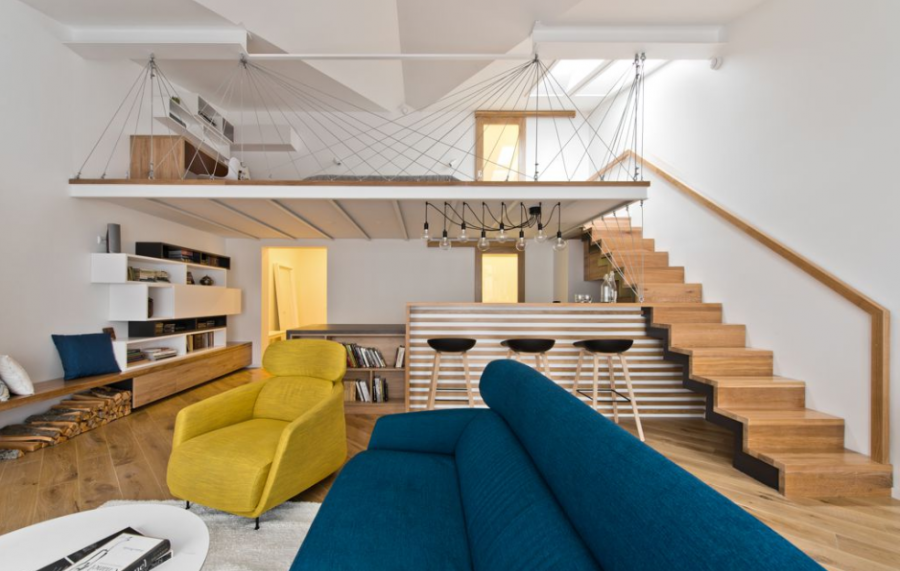 Žavios moters dviejų kambarių bute Trakuose su vaizdu į ežerą turėjo būti jauku ir šviesu, lengva ir smagu gyventi. Interjero šerdimi tapo pagrindinėje gyvenamojoje erdvėje suprojektuota ant trosų pakabinta antresolė. Jos viršuje įkurdintas atviras šviesus ir lakoniškas miegamasis su drabužine. Apačioje įrengtą virtuvę nuo svetainės zonos skiria medinis baras, kuris jungiasi su laiptais. Ant svetainės sienos integruotas židinys kartu su TV bei audio sistema ir suprojektuotos funkcionalios lentynos su vieta malkoms ir suolu jaukiam pasėdėjimui. Dinamišką ir žaismingą interjero nuotaiką kuria linijų ritmas, asimetrinė baldų kompozicija, stikliniai šviestuvų burbulai, ryškūs minkštų baldų gobelenai, egzotiški vonios plytelių ornamentai.