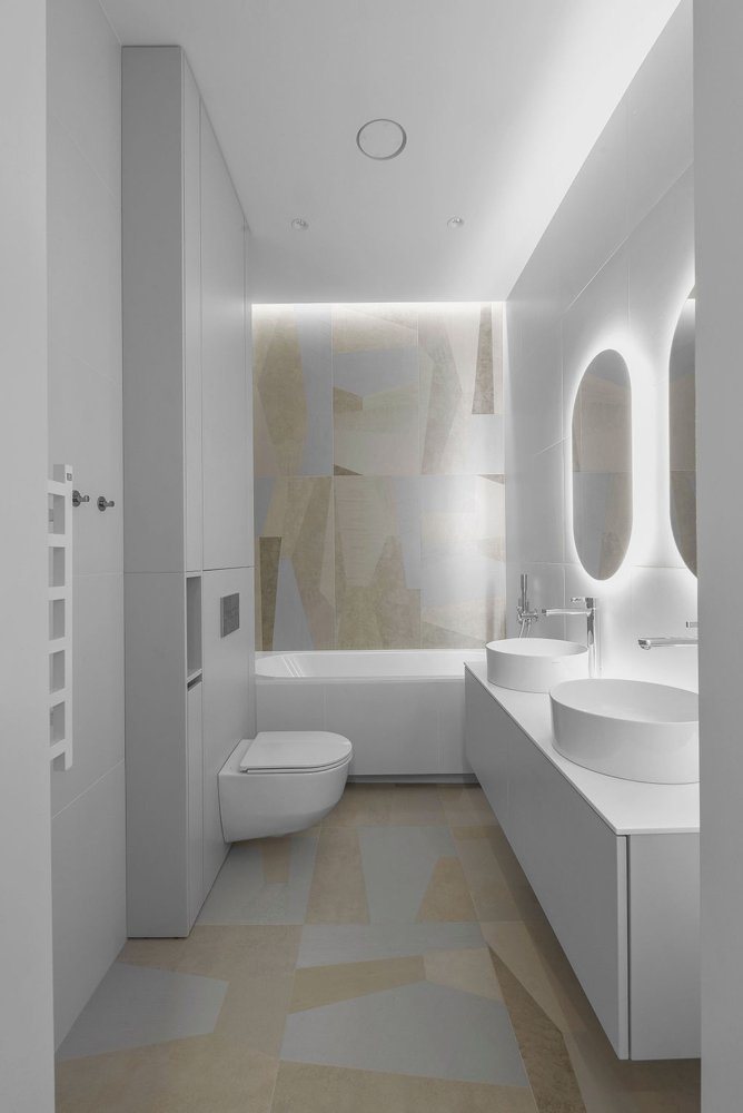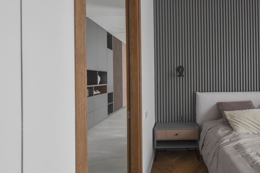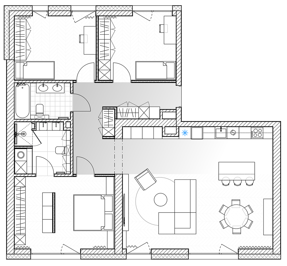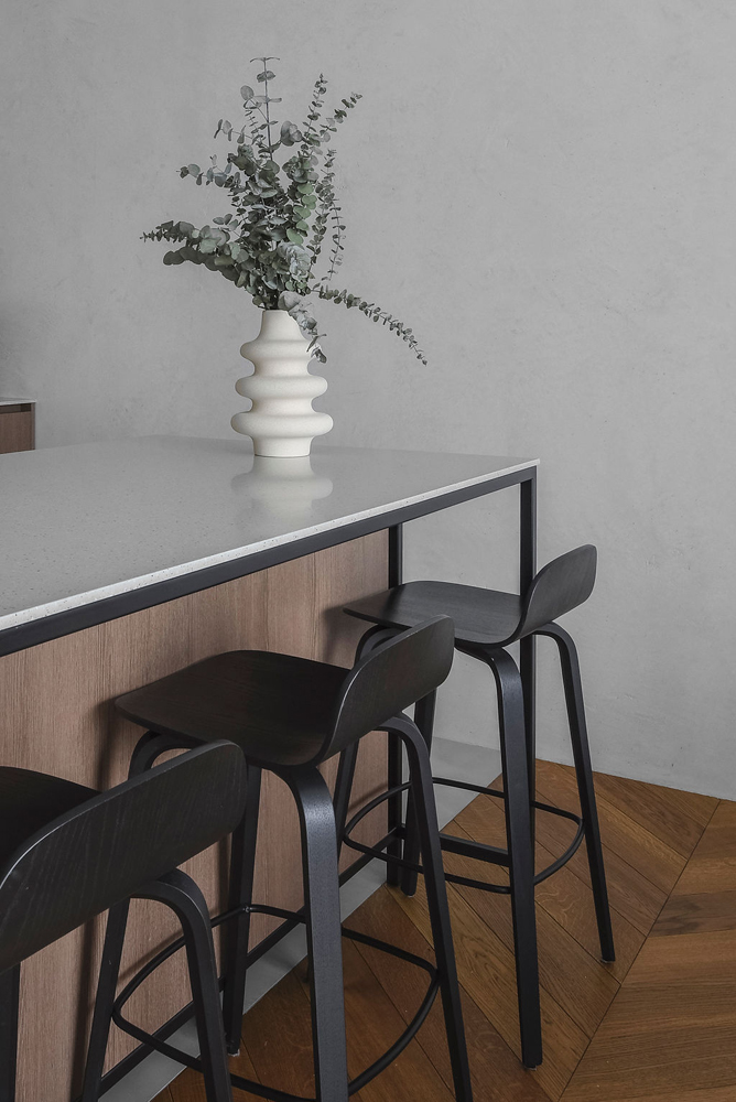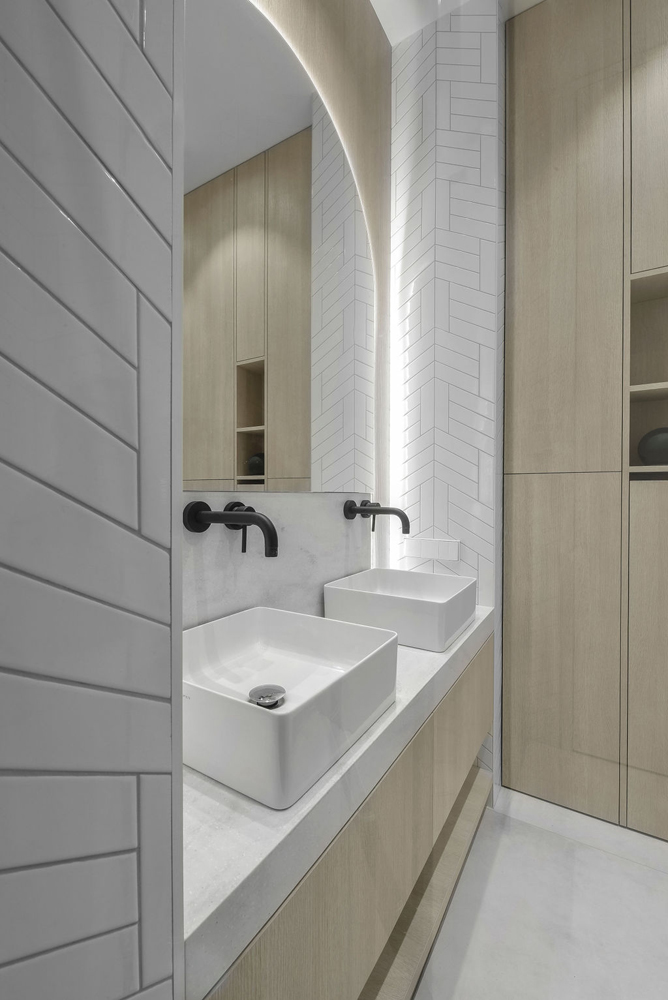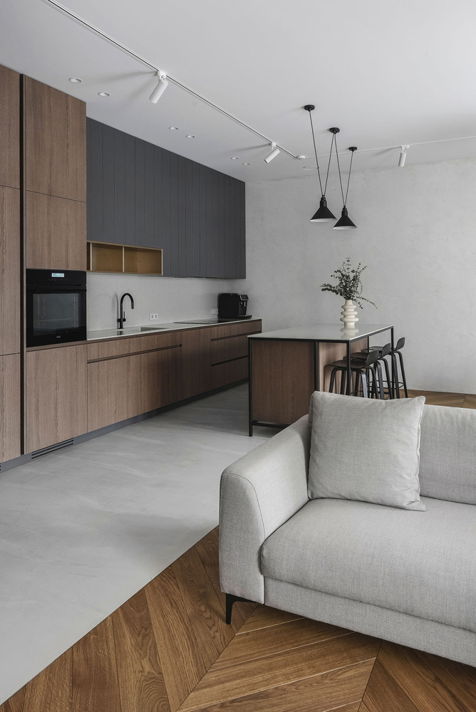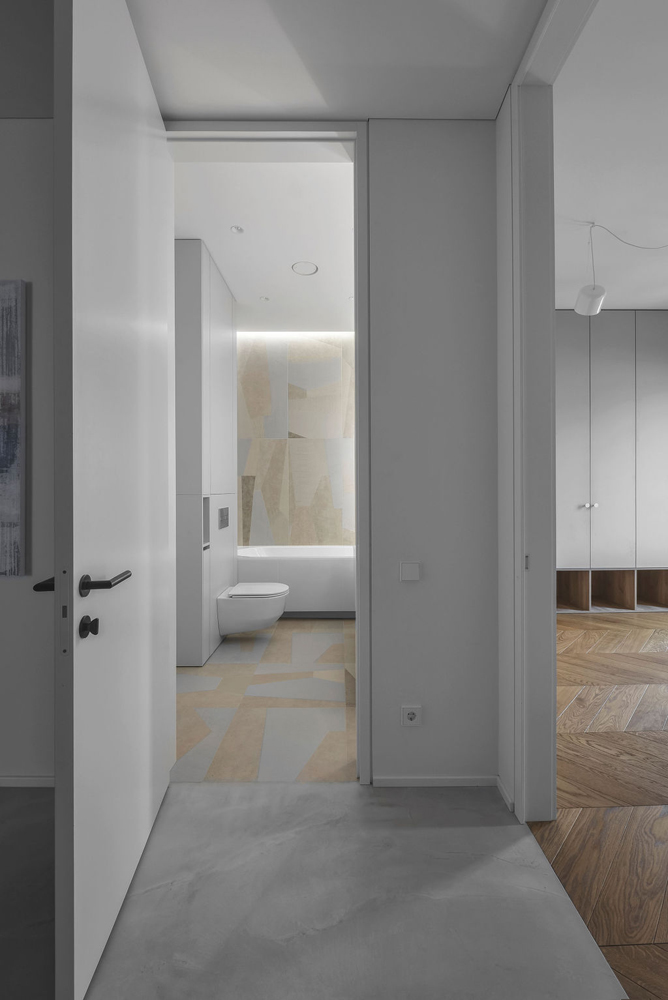 Dizaineriai nusprendė paryškinti ir išlaikyti patalpų aukštį, kuris siekia beveik 3 metrus, tad teko performuoti durų angas ir tinkamai sudėlioti vėdinimo sistemas. Durys iki lubų tapo svarbiu estetiniu elementu: vienos – sienų spalvos, o kitos suderintos su grindimis, vienos – paryškintos, o kitos – paslėptos.